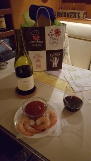 Back at the boat, the birthday dinner included shrimp (for Doug), salmon cakes, sweet potatoes, and watercress salad accompanied by a special bottle of 2002 Sanford Pinot Noir which had been resting in our wine refrigerator since our California days. Dessert – Key Lime pie, of course. No candles.