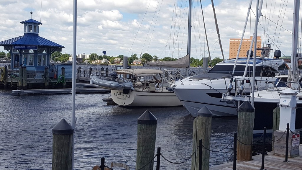 We had great conditions to go all the way to Norfolk from Deltaville on Wednesday (6/19), pulled into our slip at Waterside Marina in downtown Norfolk, and enjoyed the now familiar sights and sounds from the colorfully-lit restaurants, the ferry and tour boat horns, and passers-by on an evening stroll. We enjoy this city every time we come here. There’s always something memorable (and humorous) from each visit, and our first night here did not disappoint with our dock neighbor’s unique way of tying up his boat while dropping in for dinner along the waterfront. (Several years ago we observed a passenger giving the dock hand the requested line – all coiled up and attached to nothing).
