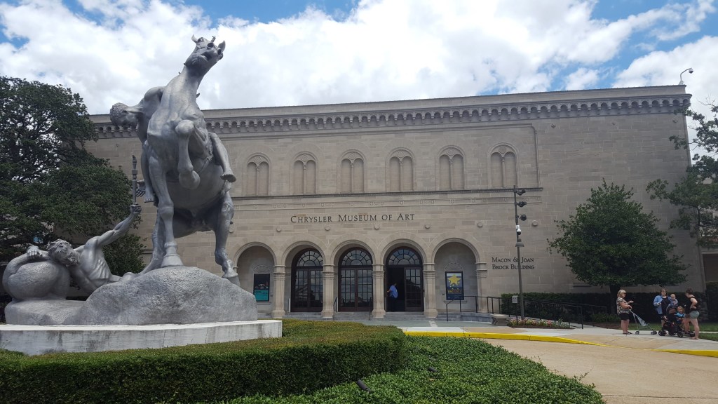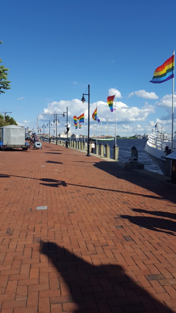 Friday was still windy, but a beautiful and much cooler day for walking a few blocks through downtown to the Chrysler Museum of Art. This (free!) museum has two floors of paintings, sculptures, glass, interactive displays, crafts tables and reading areas for children, a cafe, and gorgeous outdoor gardens. What a discovery! We took side streets back to our boat, walking through the Freemason district while admiring the beautifully restored historic homes and watching our step as we crossed the old brick streets. Back at the waterfront, crews were busy getting things ready for Pride weekend.