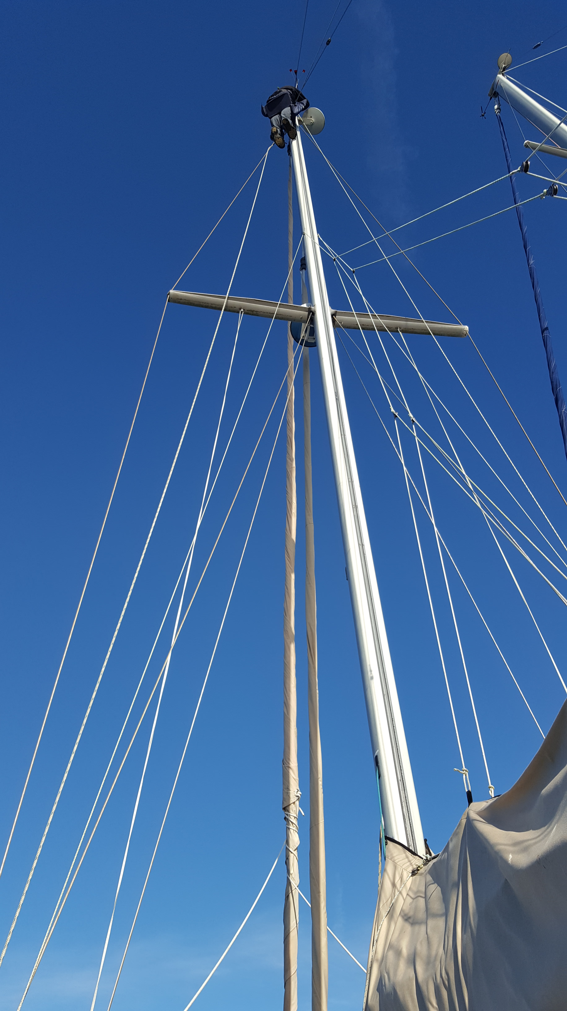 Wednesday morning found us up early in advance of the arrival of Peter, of “Scrubbing Bubbles Marine & Dive Services.” Peter agreed to install our new wind indicator at the top of the mast (our old one had been dismantled by various birds who thought it was a fine perch) as well as diagnose the problem with our masthead light. The solution for the light is pending (Peter will be back on Friday), though the new “Windex” is working fine.