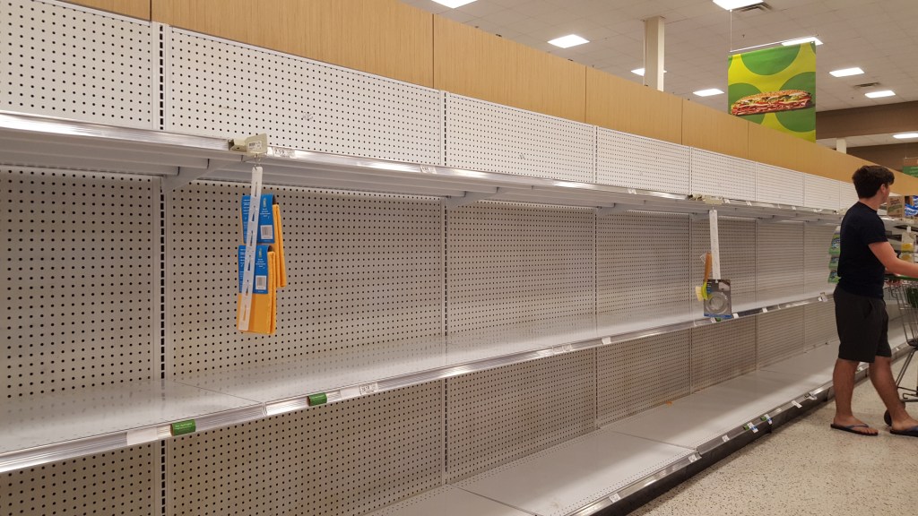We went to Publix today to stock up on a few items, since we plan to anchor as much as possible as we make our way home to New Bern, whenever that may be. As you can see from the photo, the paper products aisle is empty.