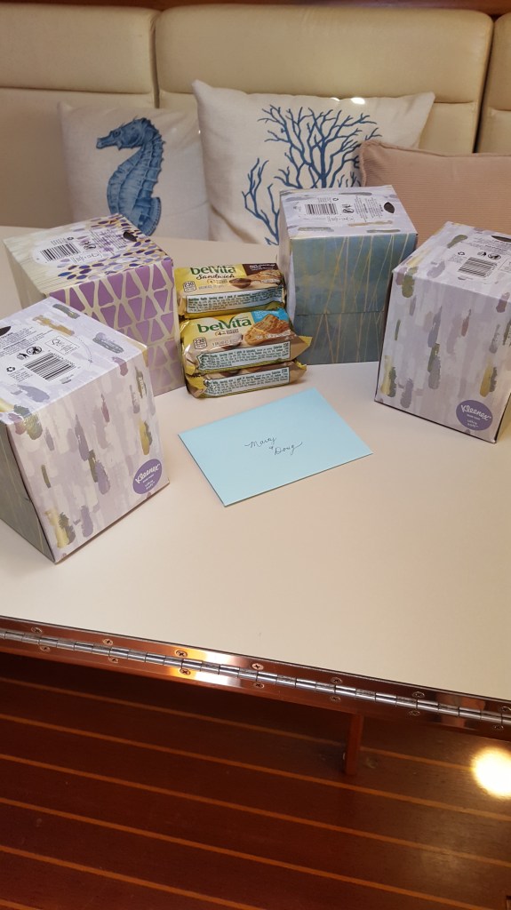 We received a care package today from our Raleigh family members, Kathy and Greg. What a gift!!! I have been trying to buy kleenex since March 16th (and, we ran out of cookies awhile ago – the enclosed note hinted that the home-made variety may be forthcoming). ☺