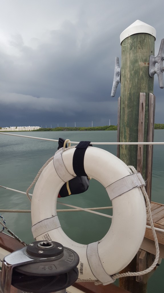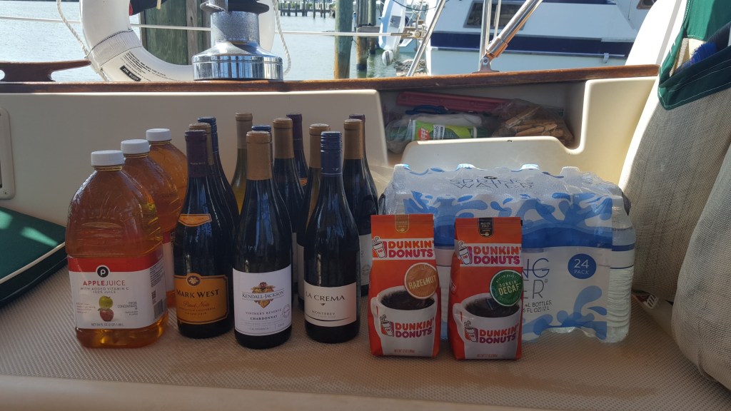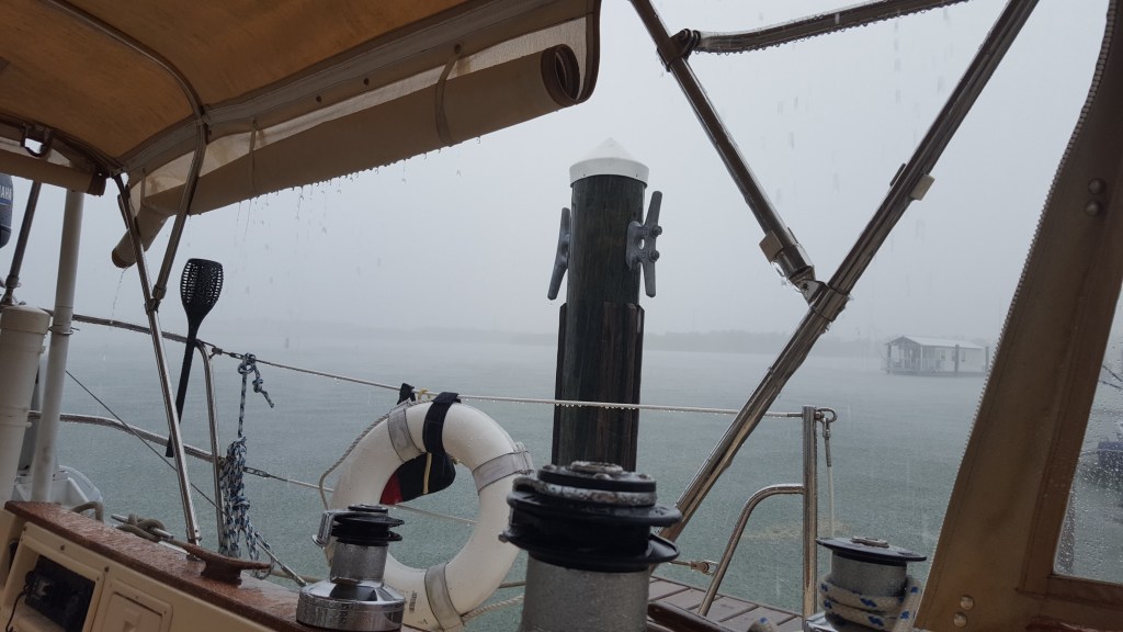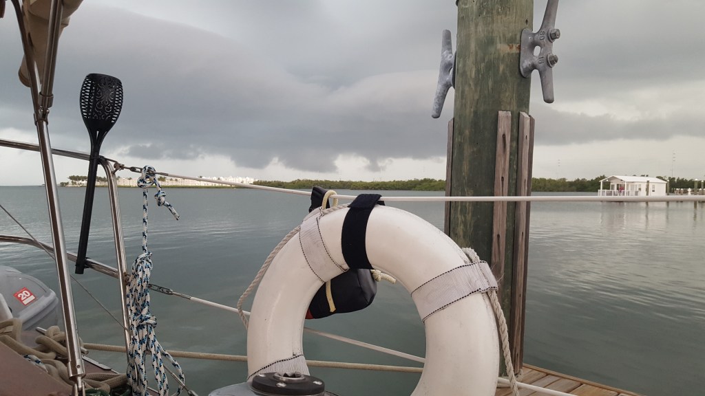 The weather cleared by the afternoon, and around 5 pm our dock neighbors from Massachusetts, Ann, Sandy, and Schooner the Goldendoodle, left the harbor and anchored out at the beach for an early Monday morning departure for home to Massachusetts. Neighbors Carrie and Mike will leave on Friday, as will we. We’ll be leaving the security of this “so clean it’s sterile” marina for an unusual journey ahead, with as few stops as possible. Doug has verified fuel availability as we head up the Florida coast.