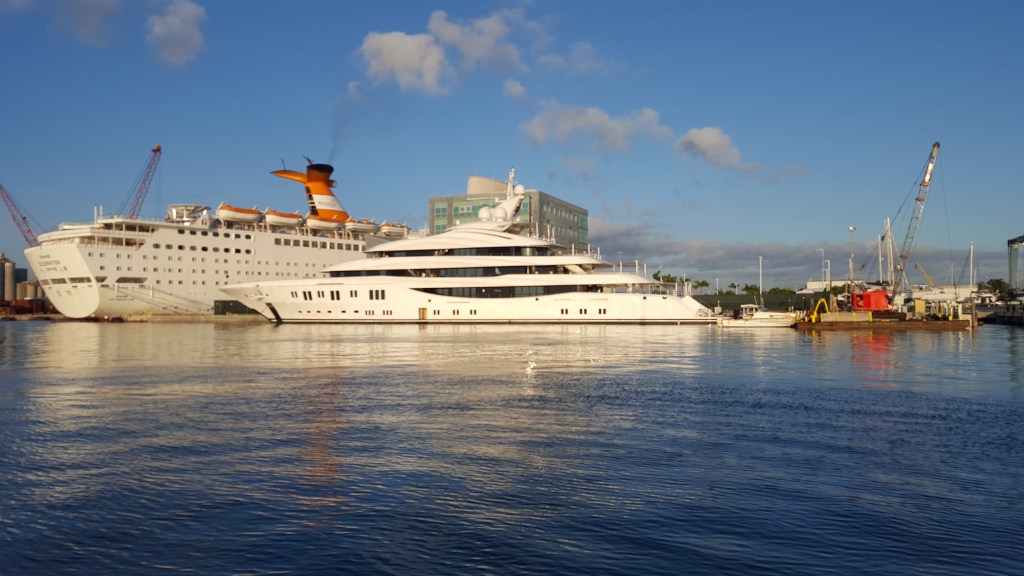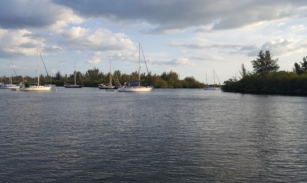 The anchor was up at 6:55 a.m., after an easier-than-anticipated evening – the wind died, and by 1 a.m. all boats were aligned in the same direction. We had a long but easy day (minus waiting for bridges to lift) to Vero Beach, arriving at 5:28 p.m. 70 miles, according to the captain. Here in the harbor, it’s like none of us ever left – we are anchored next to Brynli (as opposed to being rafted together), and friends (Bob and Diane, Jane and Dave) as well as fellow cruisers from New Bern (Gertie, Ohana) are here on a mooring ball.