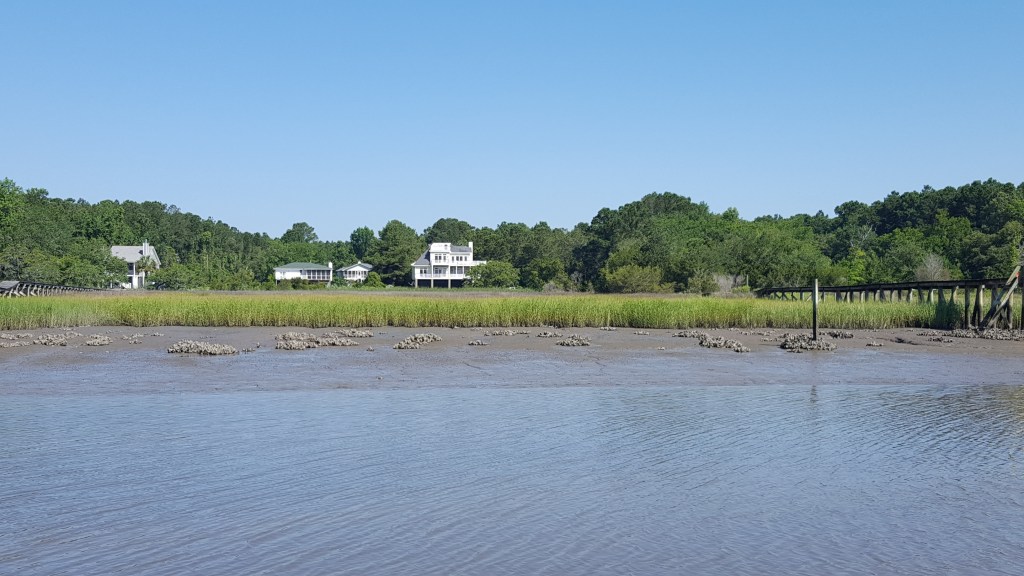 We timed the day’s trip so we’d hit McClellanville (a well-known low spot) on a rising tide, passing these homes en route when the tide was still low, but deep enough for us to pass.