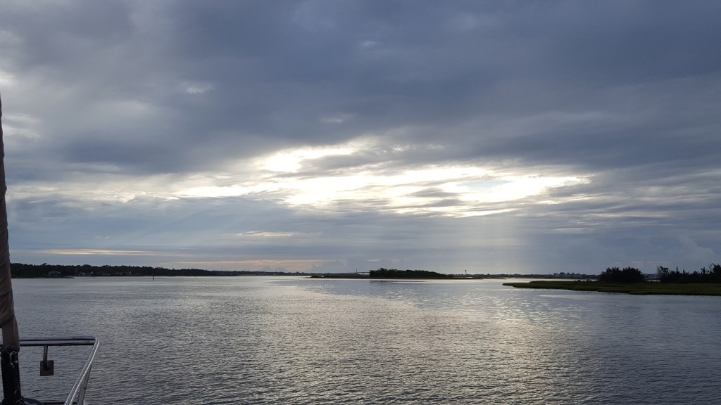 Sunrise, leaving St. James Plantation near Southport at 6 a.m. on 6/4. Doug timed our departure perfectly for the 10-mile stretch of the Cape Fear River, with the end of the flood tide coinciding with the wind out of the south. We arrived at Harbour Village Marina in Hampstead at 3 pm, sooner than expected since we were motoring at 10 mph for a good portion of the morning.