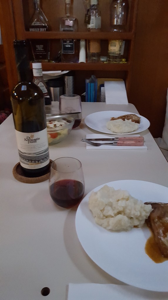 The only part of this dinner that was pre-planned was the wine, a gift from our Bauer’s Cove neighbors. We wanted to get take-out from one of the local restaurants: our first choice closed at 6 pm (we called at 6:09), our second choice was so busy they could no longer accommodate take-out orders, and the phone for our third choice was apparently off the hook (our conclusion after five phone calls and a rapid busy signal). The wine was delicious, and dinner was fine, though we were both looking forward to a night of no cooking and no dishes. For our New Bern friends, it appears that Swansboro is now open for business.