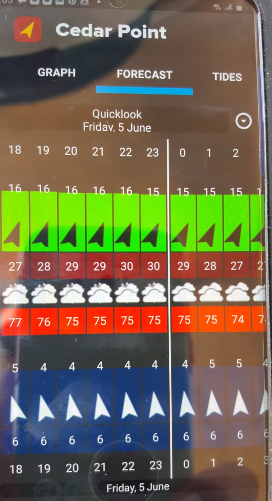 This forecast with wind gusts (in maroon color) prompted us to reserve a dock in Swansboro (we arrived at 1 pm on Friday 6/5) as opposed to anchoring at Mile Hammock in Camp Lejeune. So much of this cruise had been governed by high winds! We suspect it will be a very active hurricane season ahead.