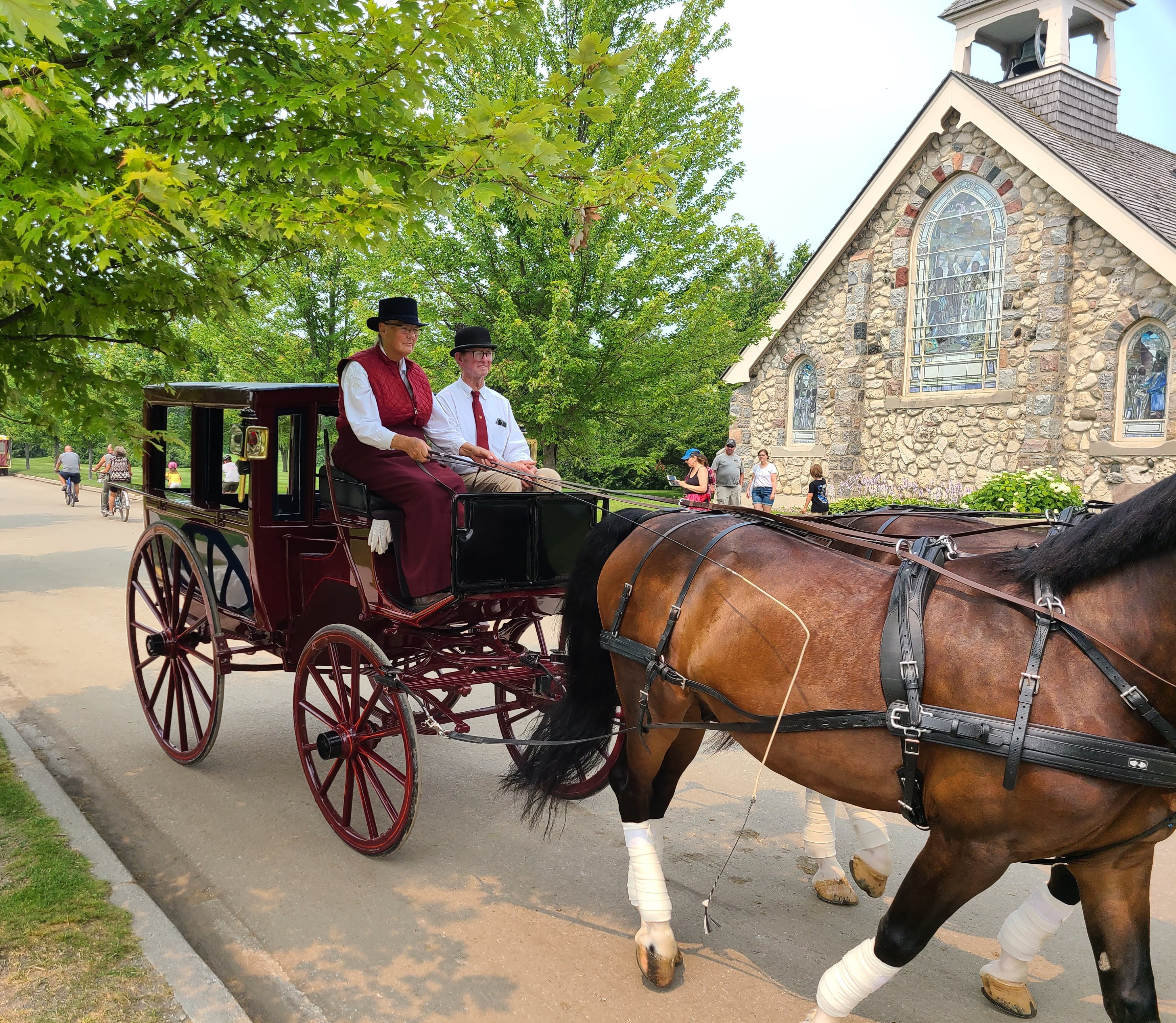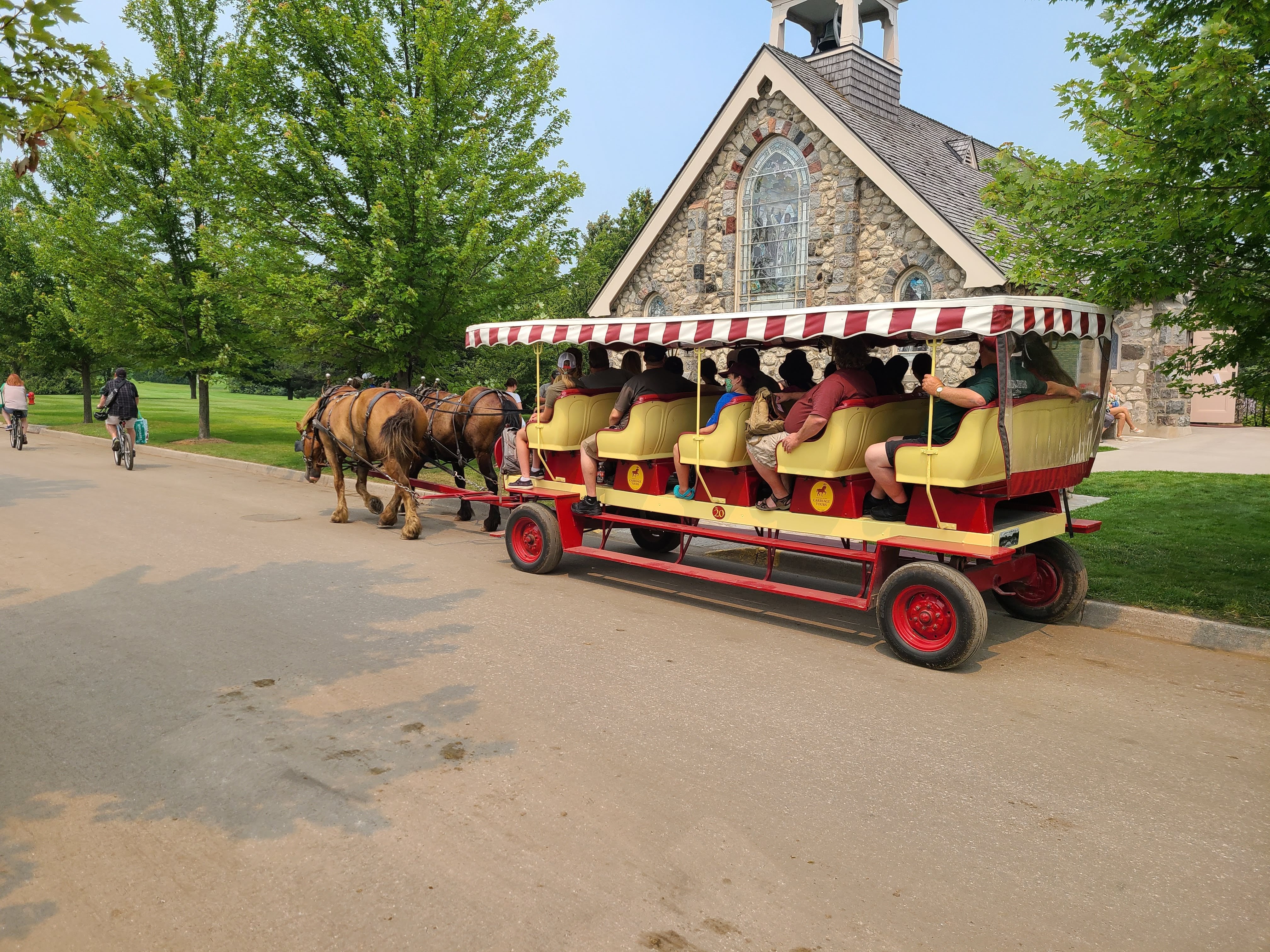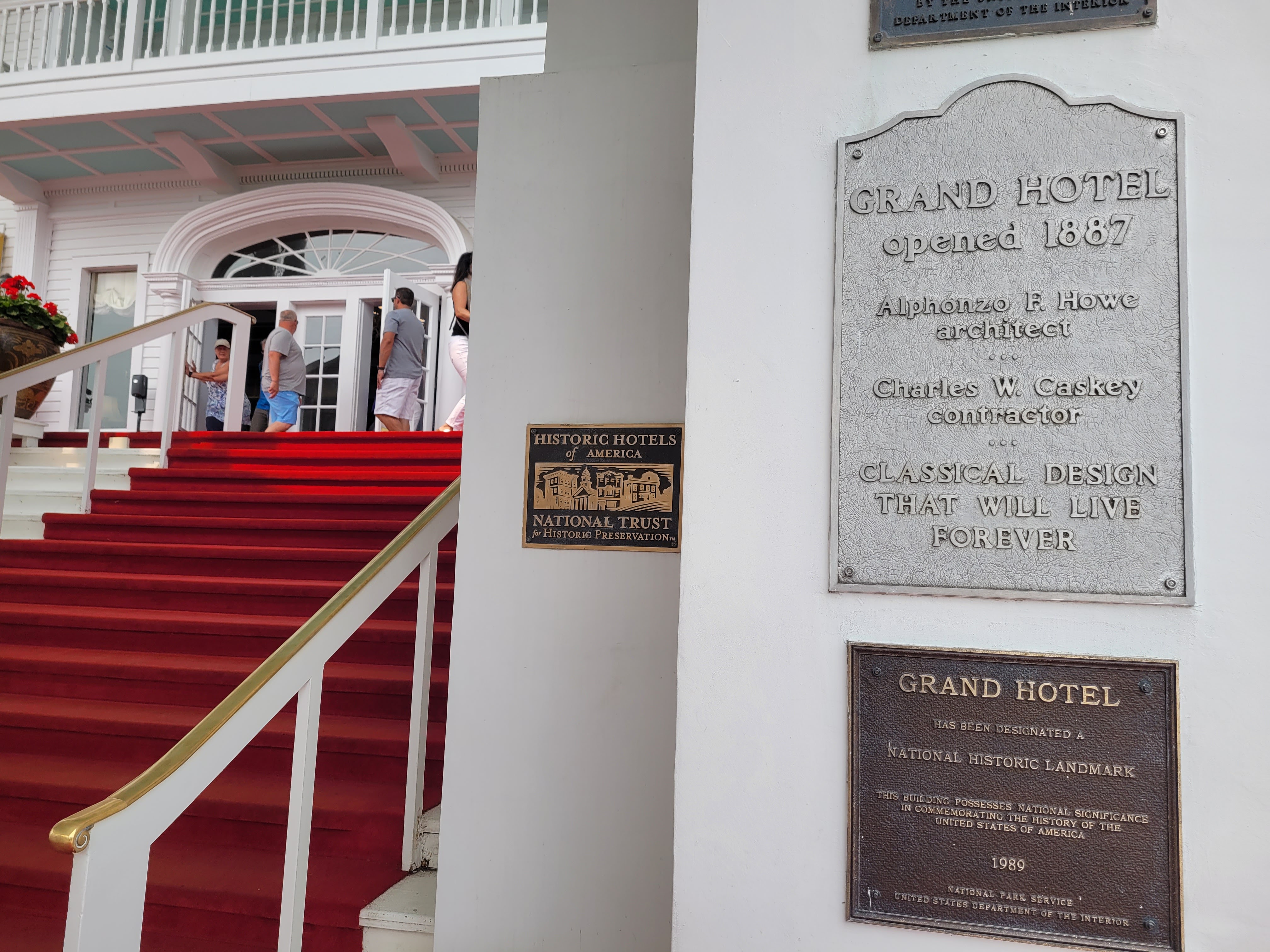 Mackinac BridgeGrand Hotel on Mackinac Island taken from the ferry.This is the view from the bike path around Mackinac Island – a distance of 8.2 miles. We brought our own bikes rather than rent, so we started our ride as soon as we got off the ferry. Halfway around the island we encountered a roadblock, so we turned around and went up the British Landing Road to eventually arrive at The Grand Hotel. The following pictures were taken along the way.Entrance to the Wawashkamo Golf Course, established in 1898. It is one of the oldest clubs in Michigan.Airplane taking off from Mackinac Island Airport. (We made it to the top of the hill!)We arrived at The Grand Hotel, with Marty making a spectacular entrance after the downhill ride by falling off her bike in front of hotel guests, horse-drawn carriages, pedestrians, other bicyclists – perhaps a hundred or more people. Doug rushed to scrape me off the pavement, as did another bystander. I had everything I needed in my backpack to clean, sanitize, and bandage my leg, and soon after another woman came by on her bike to show me her bruises from a similar mishap. Undeterred, as she was also, I got back on my bike after exploring the grounds of the hotel.Horse-drawn carriages are everywhere. Automobiles were banned on the island in 1898.