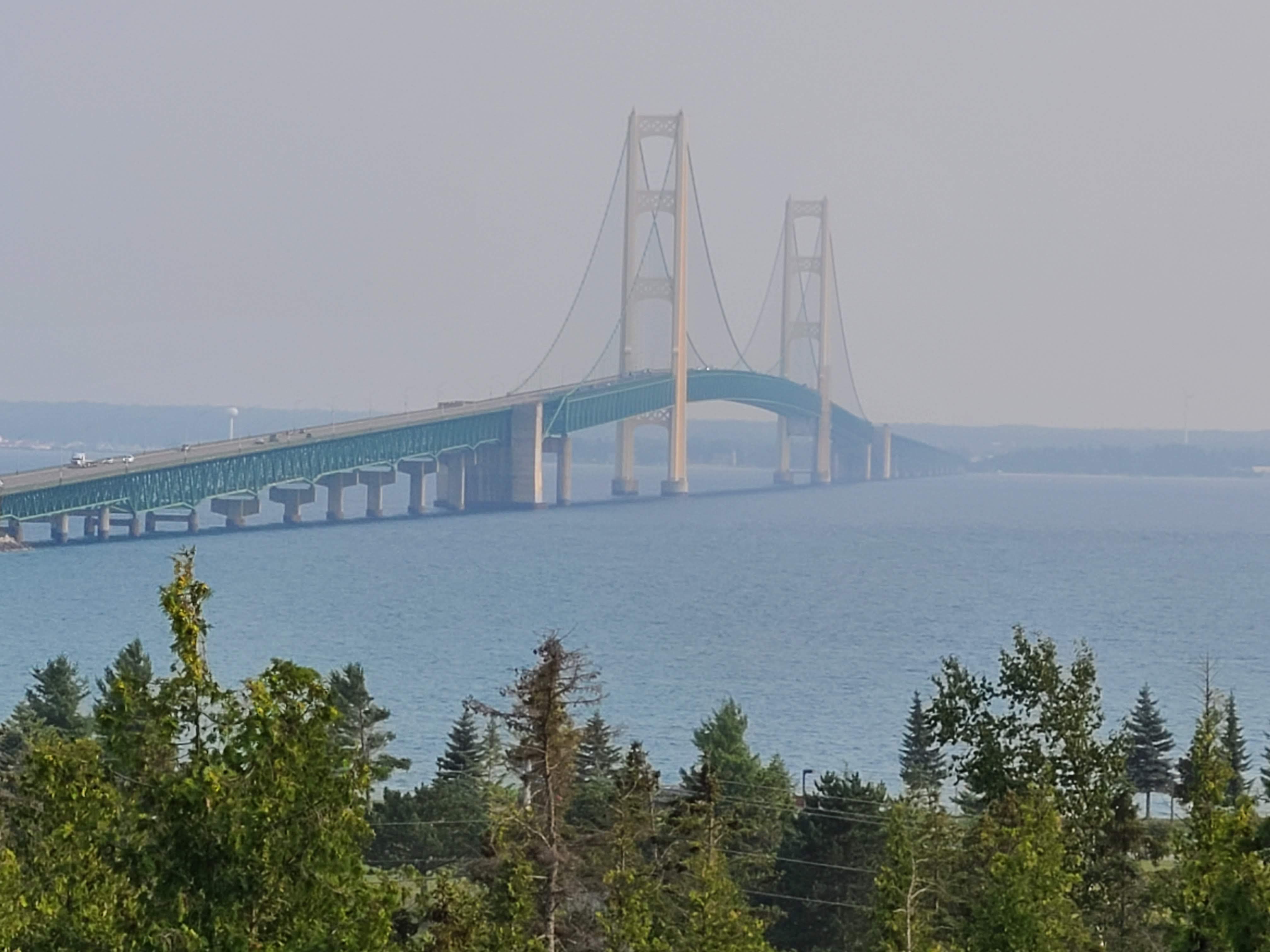 This sign was our first clue that we were truly heading into the north country. Our second clue was the sign saying, “Watch for Moose.” We were entering “Yooper” territory, referring to the residents and natives of Michigan’s Upper Peninsula. Our campground was located in St. Ignace (pronounced Saint “Igness”), which put us close to the ferry over to Mackinac (pronounced “Mackinaw”) Island. Below are pictures of the Mackinac Bridge, which leads to Mackinaw (the “w” is the correct spelling) City.
