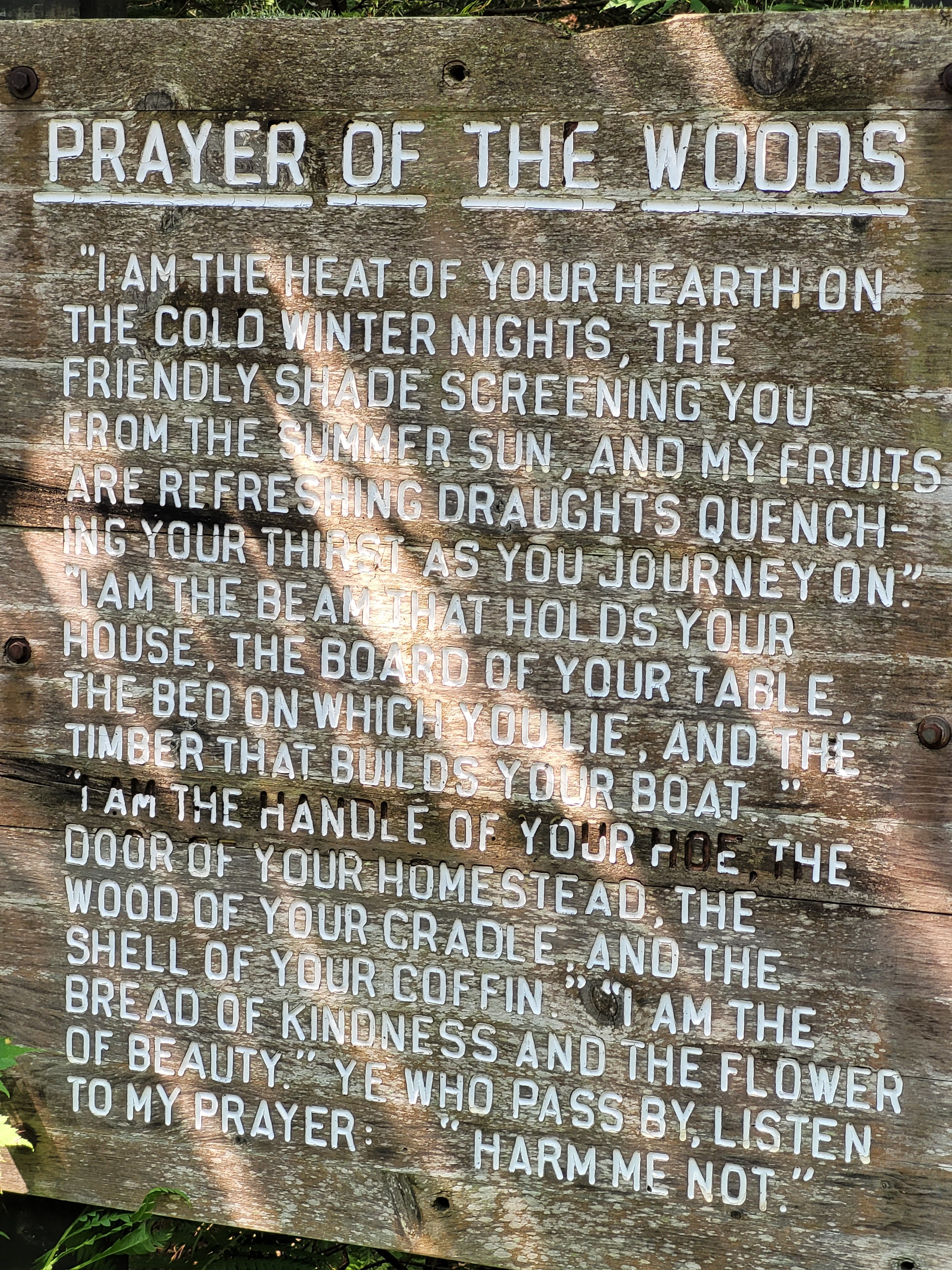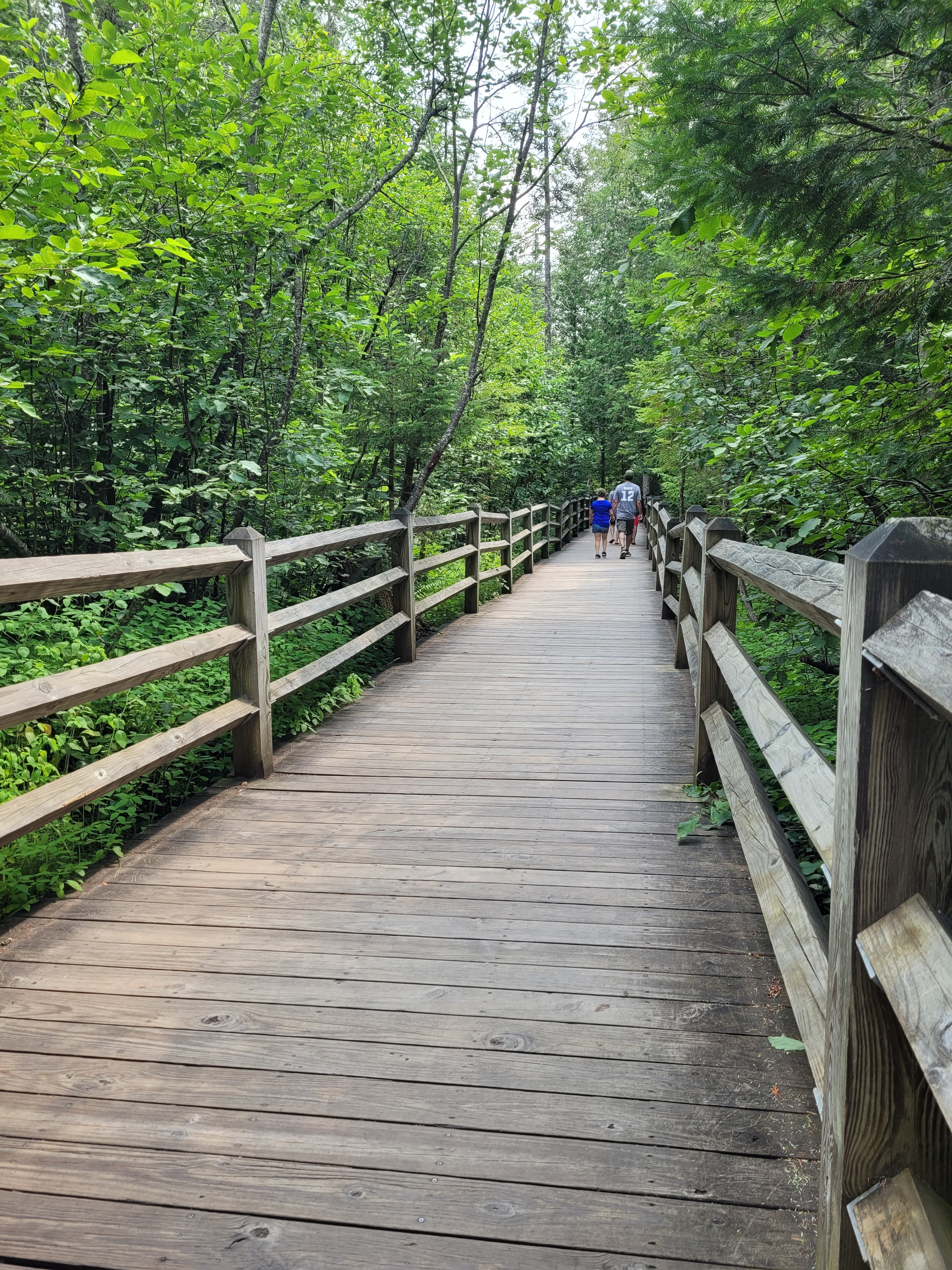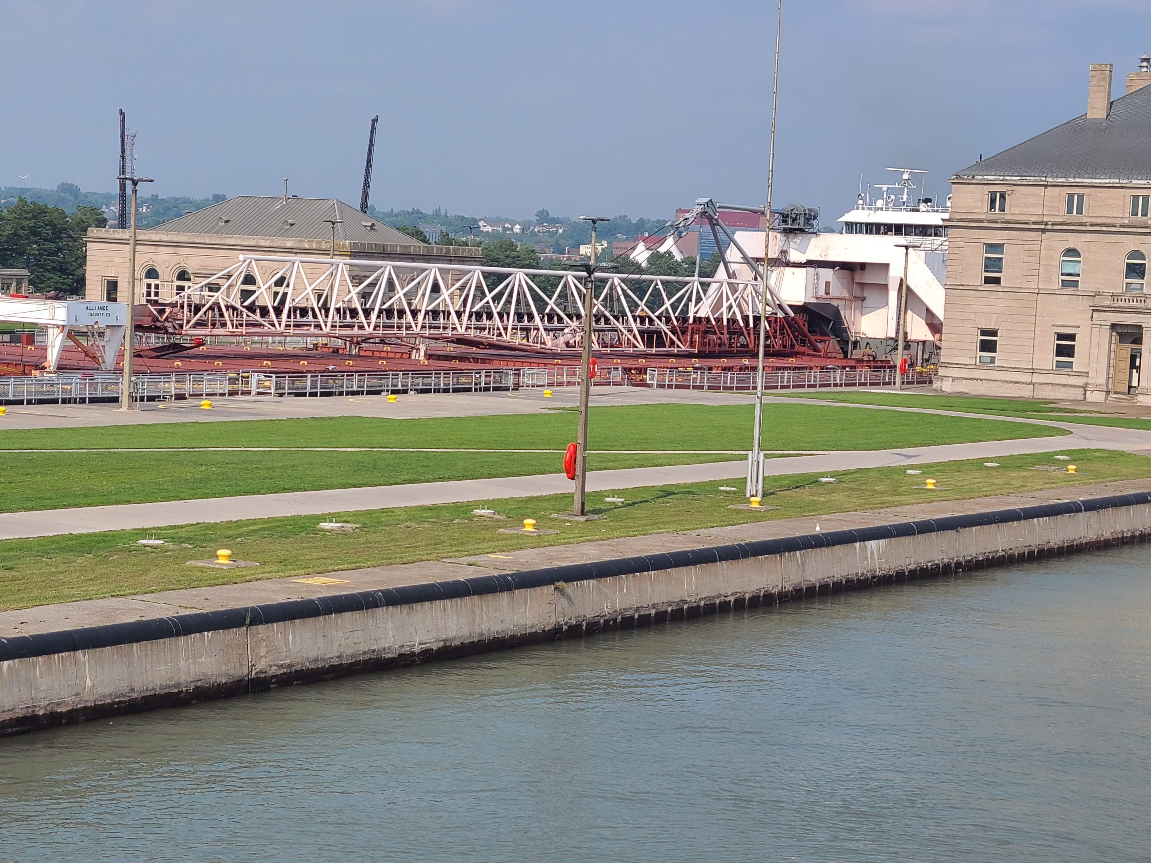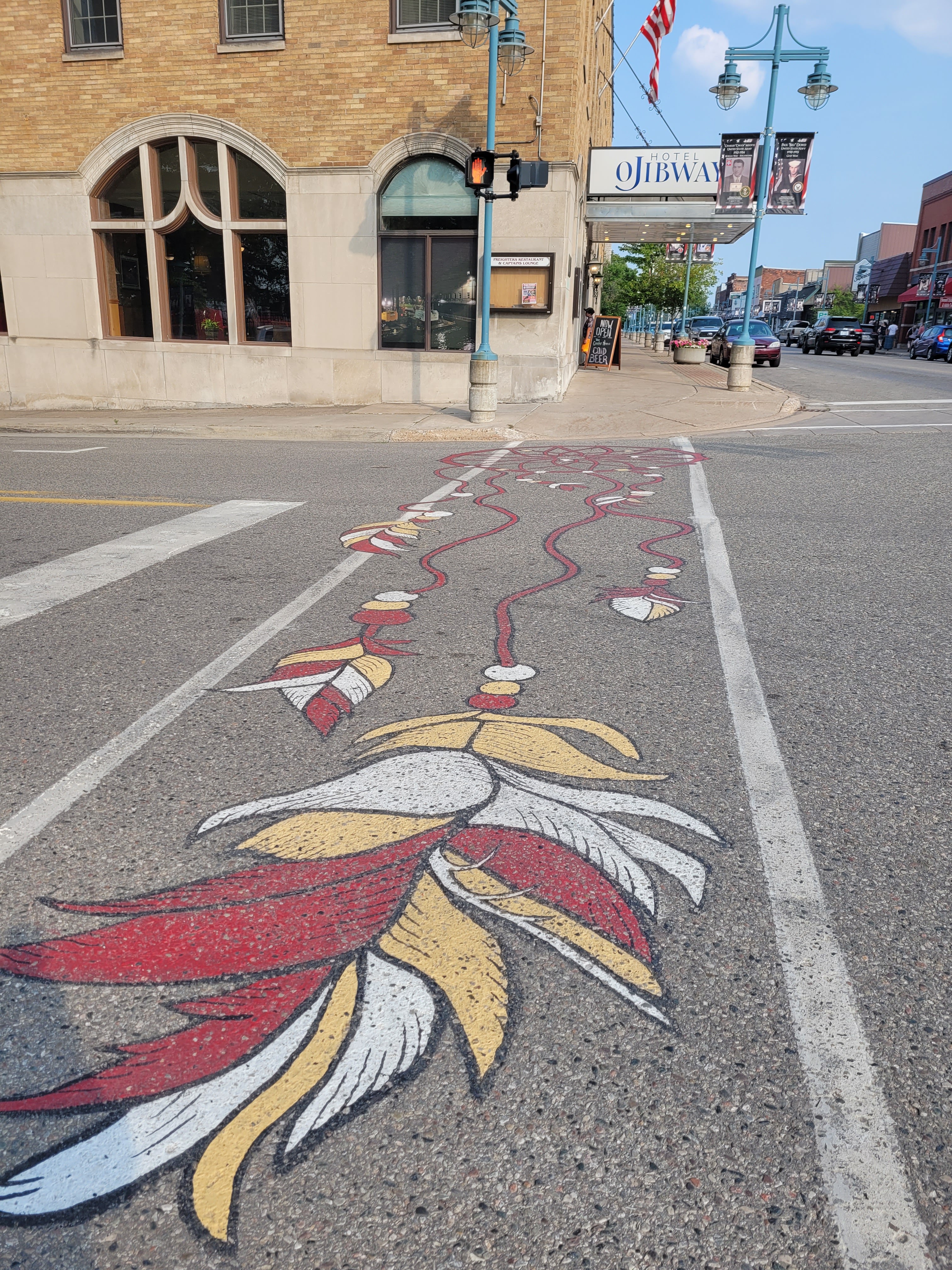 Tahquamenon Falls State Park, in Paradise, MI, encompasses 50,000 acres, most of it being undeveloped woodlands. The jewel of the park is the Tahquamenon River with its series of waterfalls. (Tahquamenon rhymes with phenomenon.)The walk along the river to view the lower and upper falls is approximately one mile, made easy by the beautiful wooden walkway. The lower falls, consisting of five waterfalls, can also be viewed from an island in the river, which is accessible by boat. Boats are available for rent from the park’s concession. To get a closer view of the upper falls, a set of 94 steps takes you down to viewing platforms.After leaving this beautiful spot, we stopped at the lodge for a light lunch, where picnic tables were available for those who chose not to eat indoors. We shared a table with another couple who told us they were from Greenville, NC, a short distance from New Bern. We’re constantly reminded what a small world this is!We arrived at the locks in Sault Ste. Marie just in time to see a ship leave the lock into Lake Superior.In the far background is the Canadian shoreline.Our timing for this visit couldn’t have been better, as another ship soon came into the lock from Lake Huron.We were told by the docent that each of these two ships was 1,000 feet long.The Native American influence in this area is not just in the names of cities and towns.Having left the Upper Peninsula, we spent one night in Fond du Lac, on Lake Winnebago in Wisconsin. Shortly after getting set up in our campsite, the weather turned nasty and our camper was pelted with hail. The next day, we drove for just a few hours back to Schaumburg, where we spent 5 more days enjoying the Gallup’s hospitality.