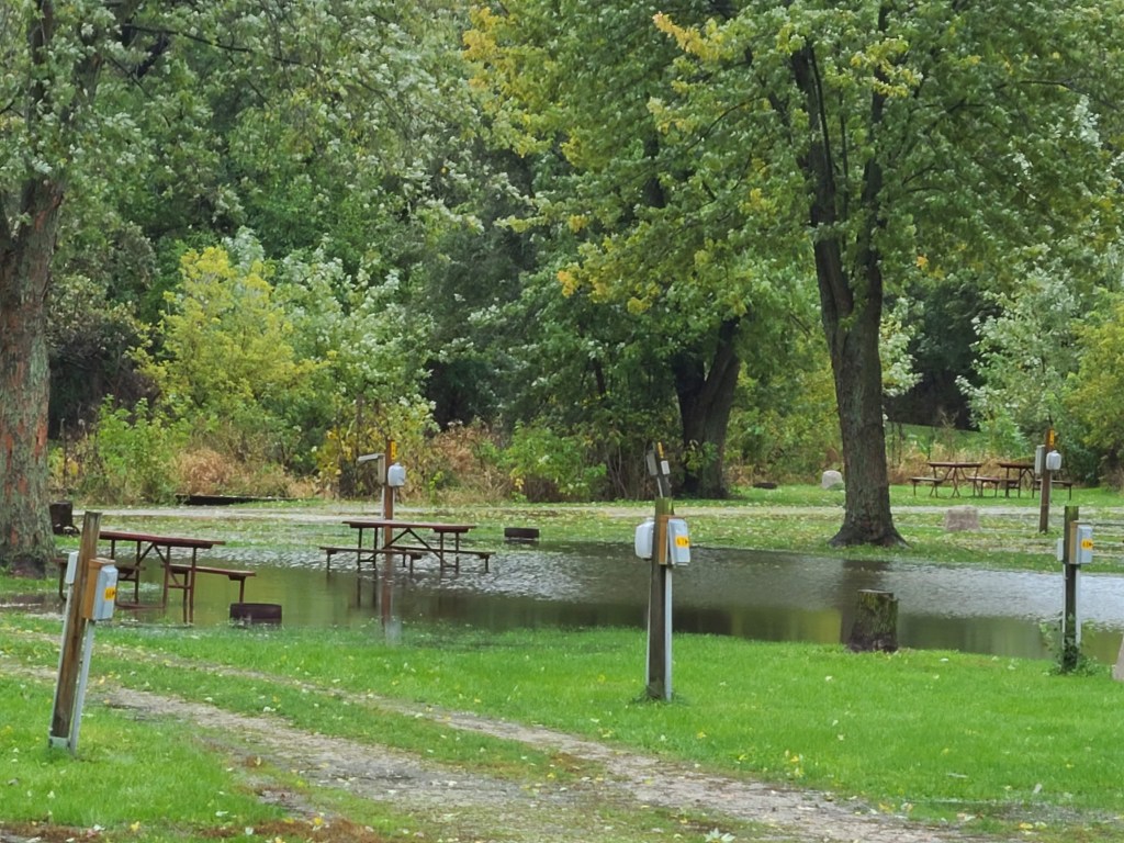 We made it back to our campsite on Sunday evening right before a storm (generated by the bomb cyclone that came in from the Pacific) hit the Midwest. Doug took these two photos on Monday after the wind and thunderstorms subsided. The campers that were in this now-flooded area were moved to higher ground well before the storm arrived.