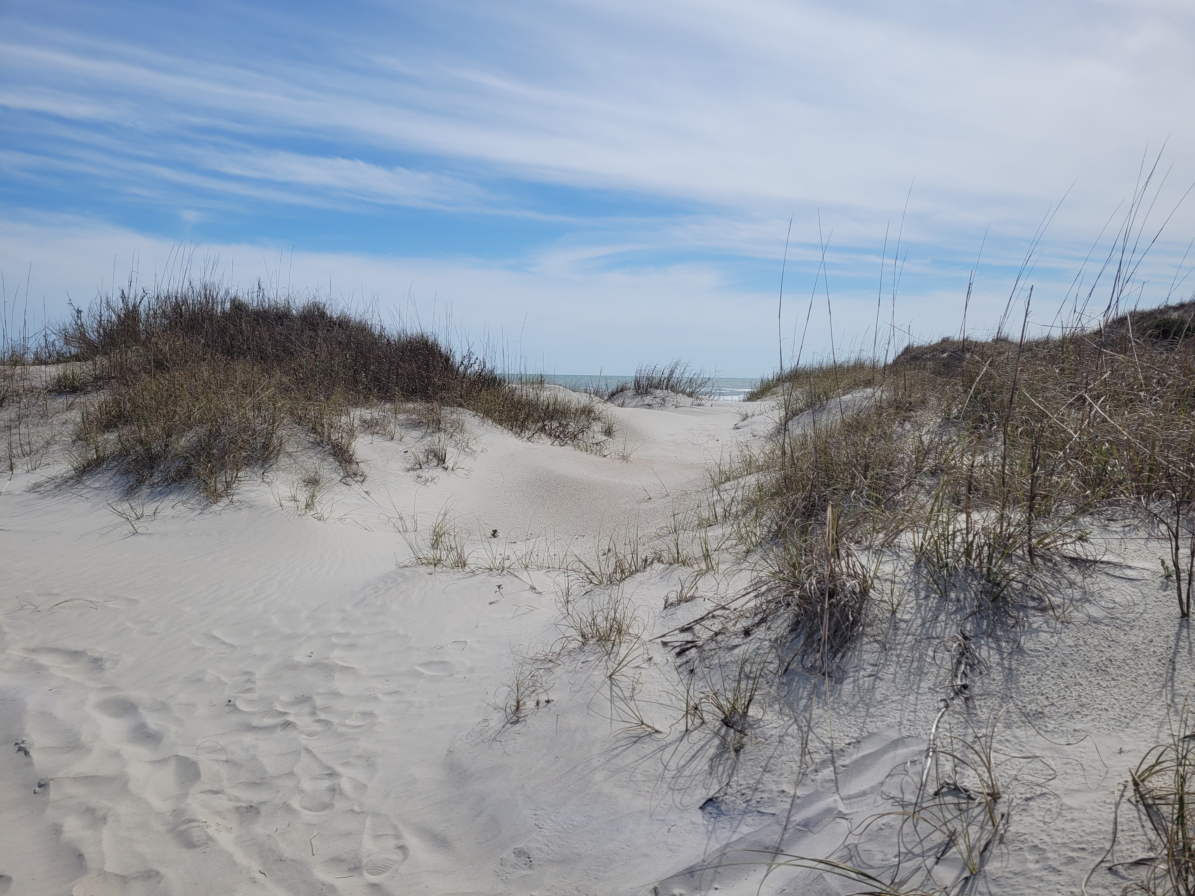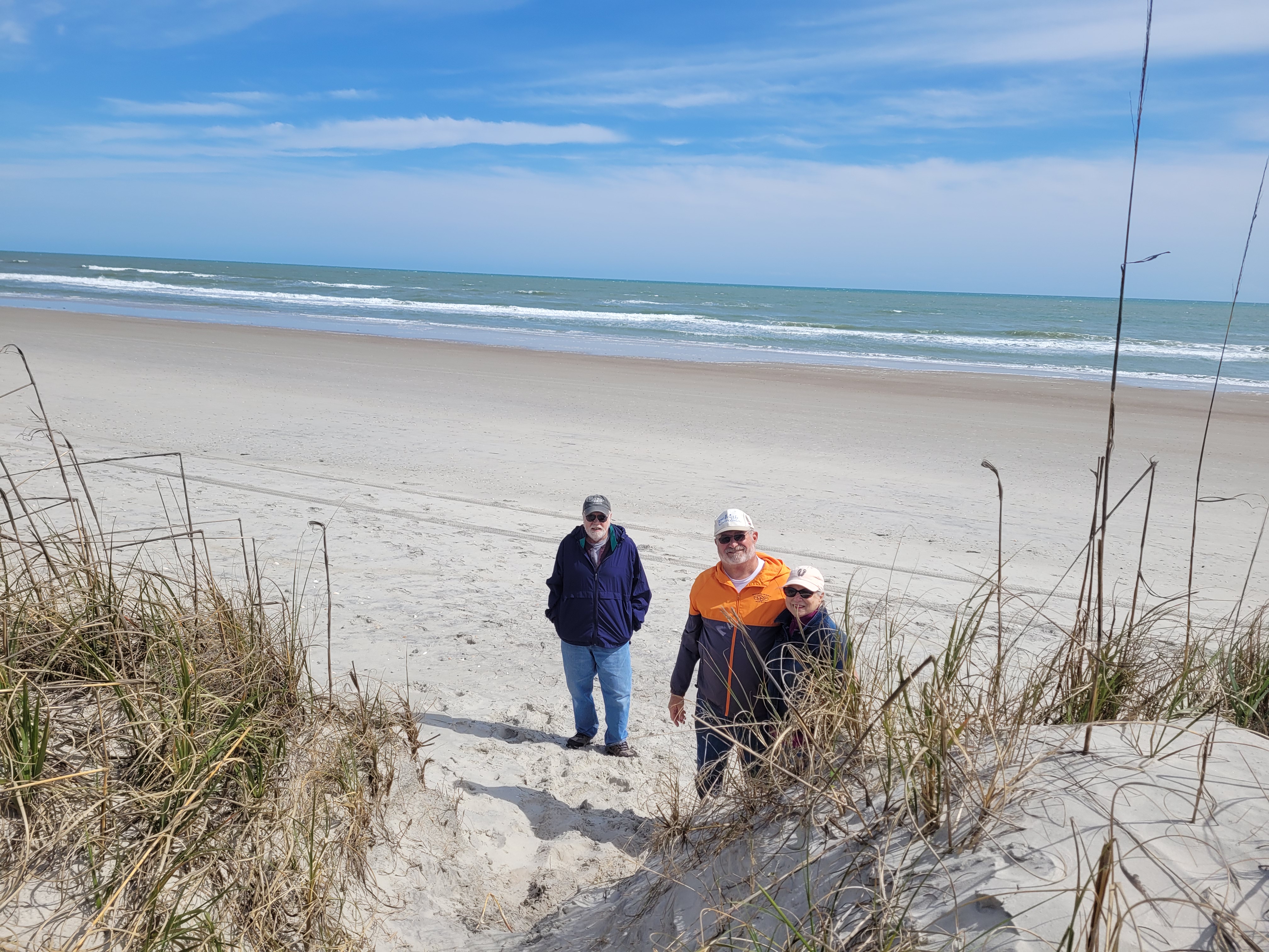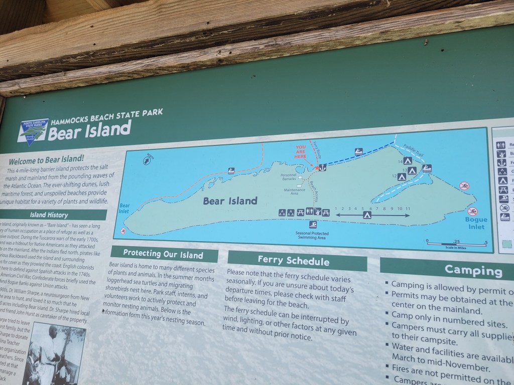Saturday was a perfect day to go over to Hammocks Beach State Park and take the water taxi over to Bear Island, a four-mile-long stretch of sand dunes and gorgeous beach, with primitive camping sites tucked behind the dunes. There were several brave people aboard the ferry who planned to camp, with others boarding the boat with their gear to go back to the mainland. When we were tent camping 25 years ago, we may have considered this type of adventure, but in our 70’s … no. There is a building on the island which houses a concession (open in warmer weather) and bathrooms.