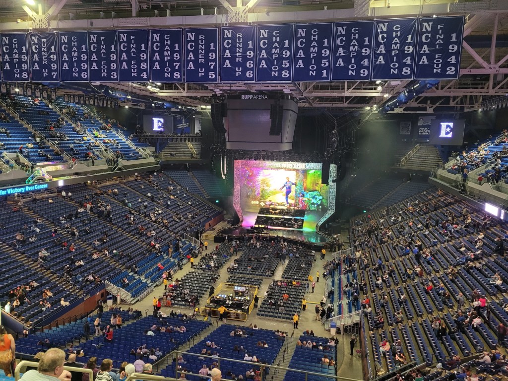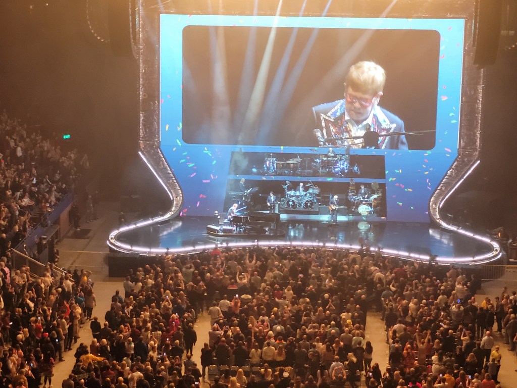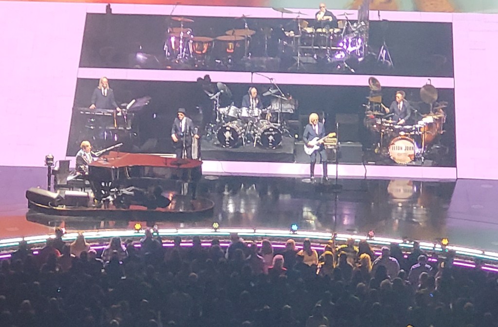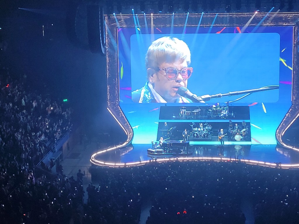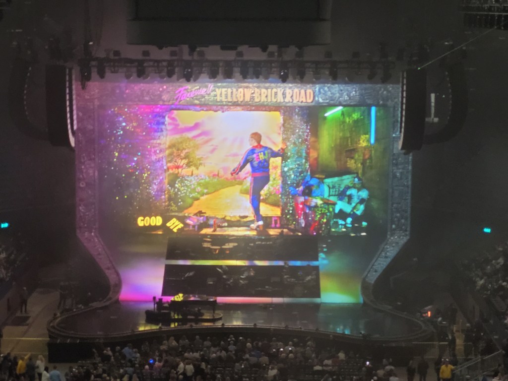He’s 75 and still incredible! Strong voice, strong hands! Our long wait for this concert was worth it, as was the splurge on tickets back in January 2000. Our seats were dead-center to the stage among the crowd of 16,000, with a great view of the band and the jumbo video screen behind and above the stage, showing Elton and his band mates up close, as well as images of “everyday” people along with stars pertinent to each song. Special effects did not overwhelm the music – while the focus was on Elton, he took time to engage with the audience and shared stories, reminiscing about pivotal points in his 52-year career. Opening up the concert with “Bennie and the Jets” absolutely made my night! The song list included the old favorites along with his newest duet with Dua Lipa, who was featured via video screen. His band was outstanding – how could it be otherwise, with three of the six being original members (Nigel Olsson, David Johnstone, and Ray Cooper). After two hours and twenty minutes (with a few very brief breaks), the encore performance ended with Elton “floating” towards the rear of the stage at the end of “Goodbye Yellow Brick Road” and through a small door in the blackened background.
