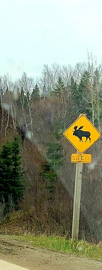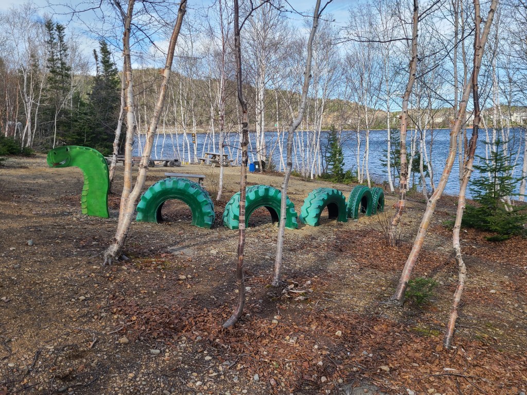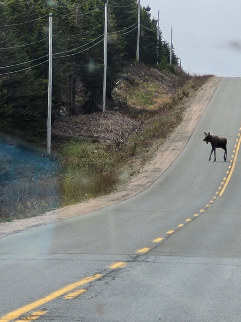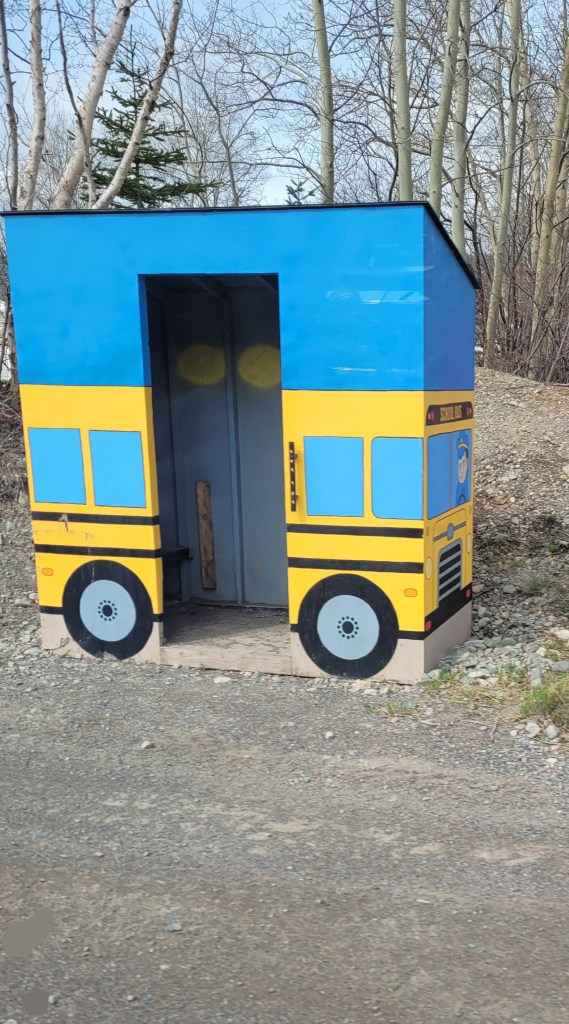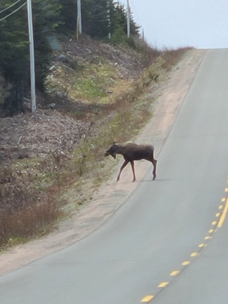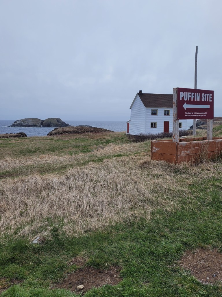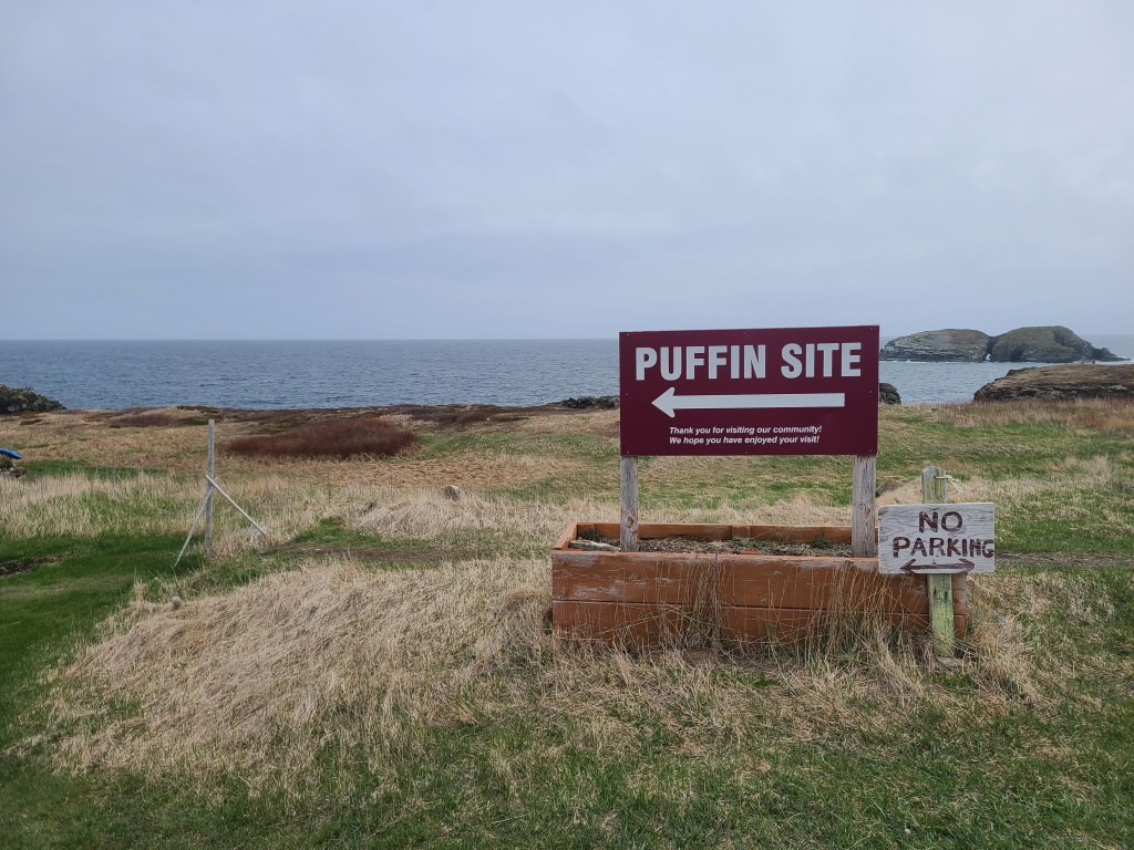 This is a man-made “Cressie”, named after Nessie the Loch Ness monster. Cressie is said to live in Crescent Lake, and she was first spotted in the 1950’s. According to an archivist at Memorial University’s folklore and language archive, the creature is still regularly seen. “It might be an oversized eel,” she said. 🙂Despite the cold, these little flowers were scattered throughout the campground and appeared everywhere along the roadside. They don’t look like the dandelions I’m familiar with – an online search led me to suspect they are Yellow Hawkweed. Whatever they are, they’re a definite sign of spring in these northern parts.Our last campfire. The campground owners give every new visitor this box filled with dry wood!So you get an idea of where we’ve been, I put post-its as identifiers: we arrived on the southwest tip of the island, stayed 2 nights in Codroy (#1), stayed 3 nights at Crescent Lake (#2 on the map) and took a day trip to see icebergs farther north; we arrived in Eastport yesterday afternoon (#3), and we took a day trip today to see Puffins (far east on the map in the town of Elliston). Below are a couple of frequently seen sights (along with clotheslines full of clean laundry – not pictured).These adorable school bus sheds keep the children warm while they wait for the bus. Each one is brightly painted, and many are whimsically decorated.Oh, yes – these are everywhere. He took his time crossing the road. These are everywhere in Elliston.When we started out from Eastport this morning, they were having snow showers in Elliston. The wind chill NOW (6:30 pm, after an afternoon of sunshine) is 29 degrees Fahrenheit, and the winds are NNE at 17 mph. It was very cold today!Here they are!Zooming in for a closer look …and, this enlargement – they even look cute when they’re a bit out of focus. 🙂