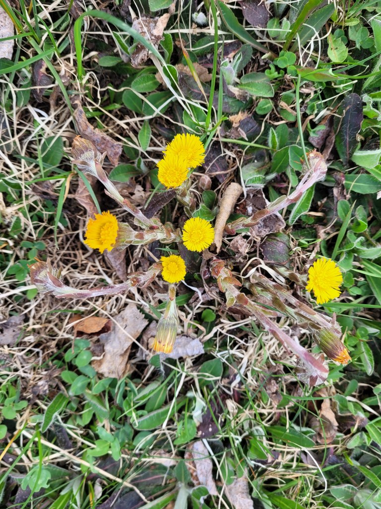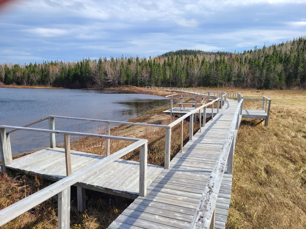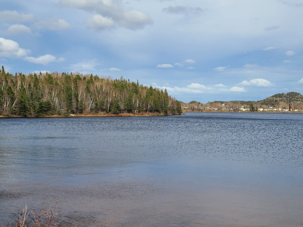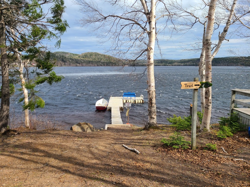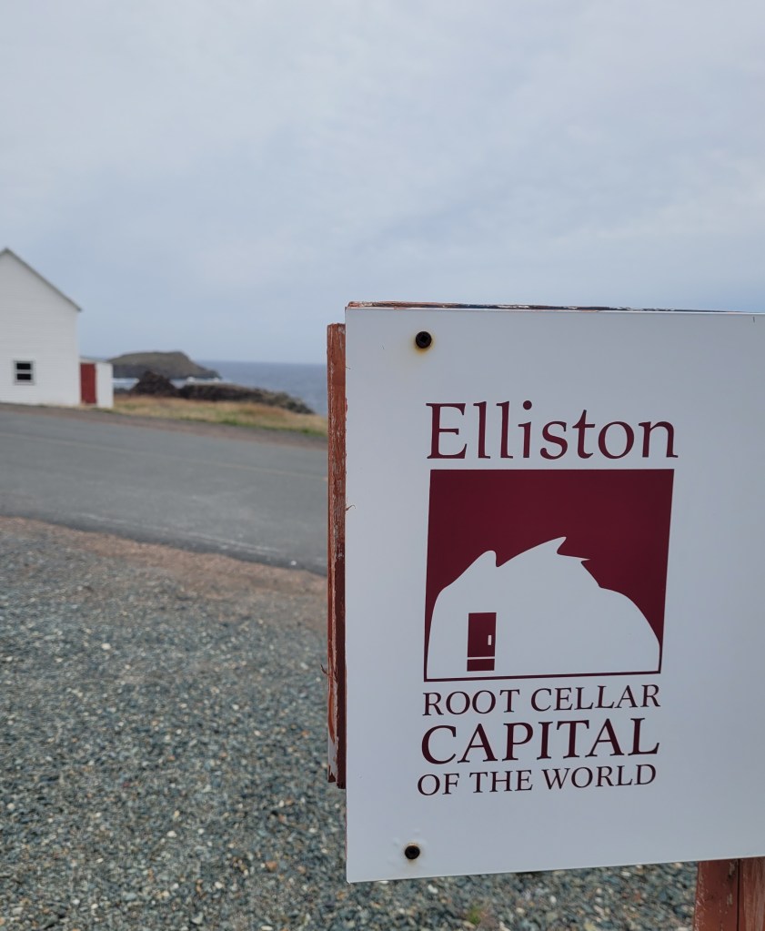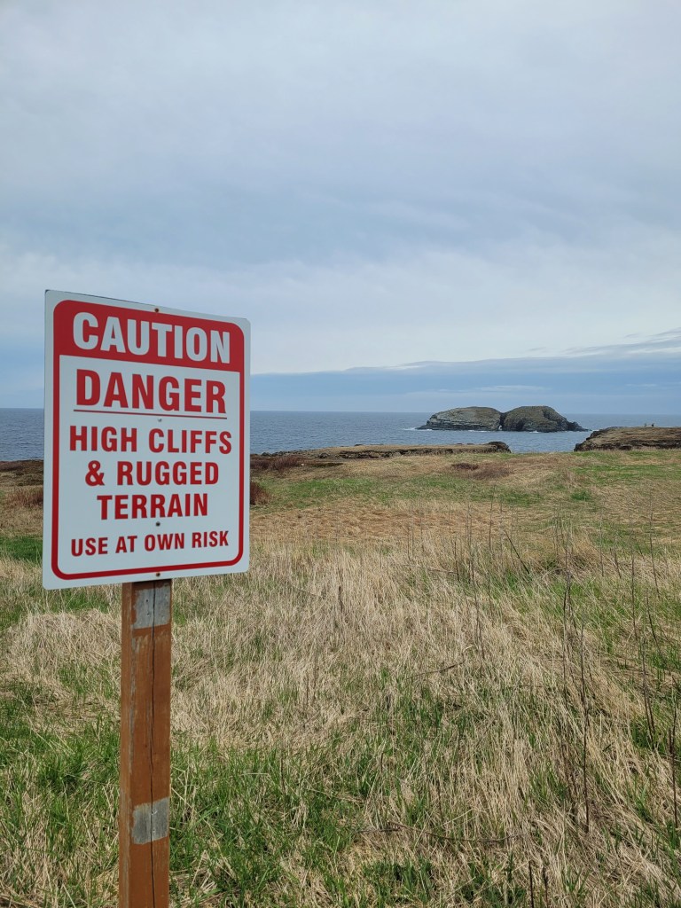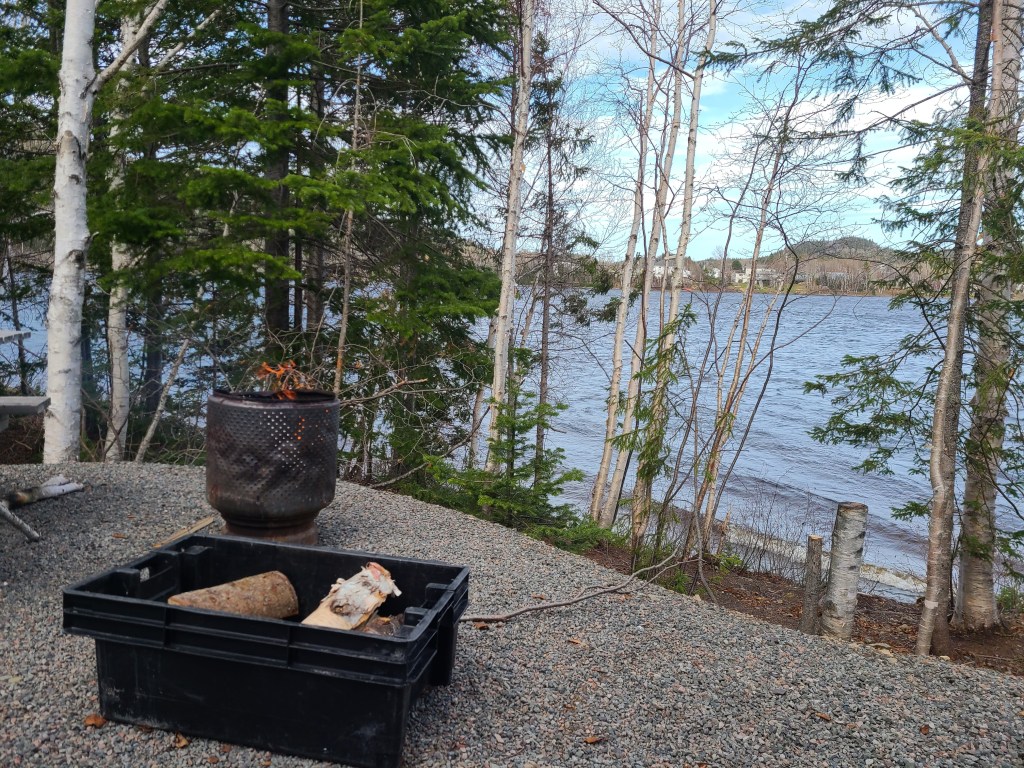This is a man-made “Cressie”, named after Nessie the Loch Ness monster. Cressie is said to live in Crescent Lake, and she was first spotted in the 1950’s. According to an archivist at Memorial University’s folklore and language archive, the creature is still regularly seen. “It might be an oversized eel,” she said. 🙂Despite the cold, these little flowers were scattered throughout the campground and appeared everywhere along the roadside. They don’t look like the dandelions I’m familiar with – an online search led me to suspect they are Yellow Hawkweed. Whatever they are, they’re a definite sign of spring in these northern parts.Our last campfire. The campground owners give every new visitor this box filled with dry wood!So you get an idea of where we’ve been, I put post-its as identifiers: we arrived on the southwest tip of the island, stayed 2 nights in Codroy (#1), stayed 3 nights at Crescent Lake (#2 on the map) and took a day trip to see icebergs farther north; we arrived in Eastport yesterday afternoon (#3), and we took a day trip today to see Puffins (far east on the map in the town of Elliston). Below are a couple of frequently seen sights (along with clotheslines full of clean laundry – not pictured).These adorable school bus sheds keep the children warm while they wait for the bus. Each one is brightly painted, and many are whimsically decorated.Oh, yes – these are everywhere. He took his time crossing the road. These are everywhere in Elliston.When we started out from Eastport this morning, they were having snow showers in Elliston. The wind chill NOW (6:30 pm, after an afternoon of sunshine) is 29 degrees Fahrenheit, and the winds are NNE at 17 mph. It was very cold today!Here they are!Zooming in for a closer look …and, this enlargement – they even look cute when they’re a bit out of focus. 🙂