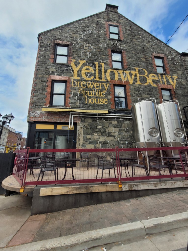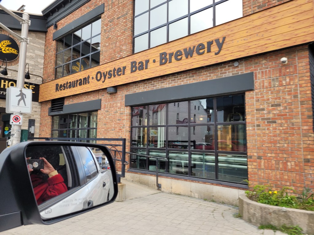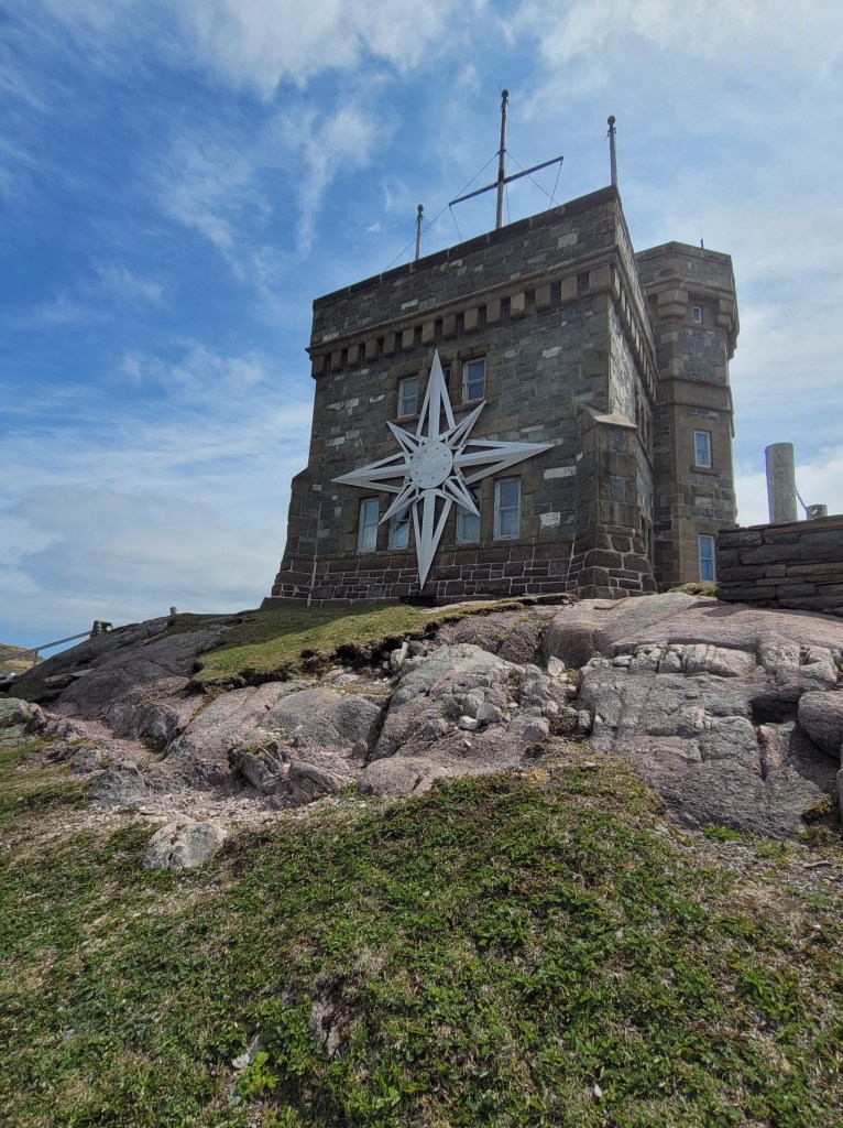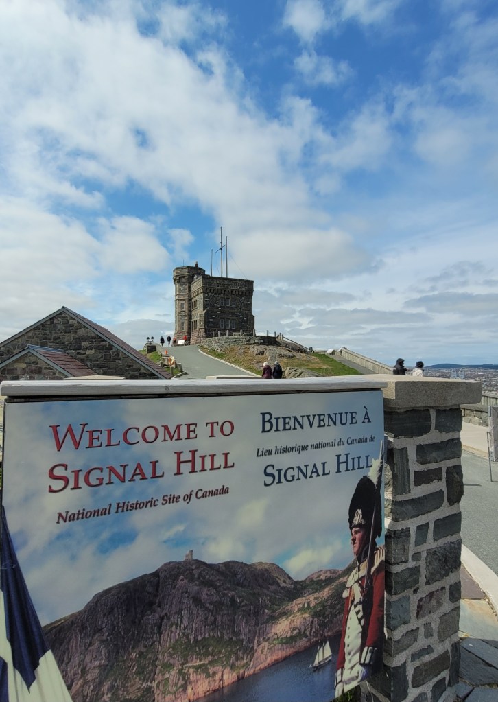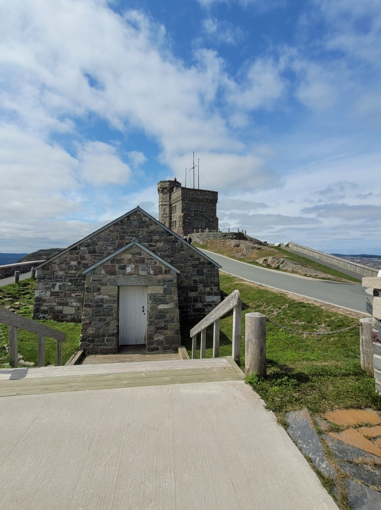 After getting settled at our campsite, you *know* Doug will head directly for the port to see the ships. St. John’s Harbour is certainly not like the sleepy fishing villages we’ve been seeing for the past couple of weeks.A drive up to Signal Hill will give us a better view of the harbor.(This shot was taken on Tuesday morning – our Monday evening harbor picture was too dark)It was atop Signal Hill that Guglielmo Marconi received the first transatlantic radio signal in 1901; in 1920, one of the first wireless voice transatlantic transmissions was made here.Cabot Tower (constructed 1898-1900 to commemorate Queen Victoria’s Diamond Jubilee and the 400th anniversary of John Cabot’s voyage to the New World)Tuesday Morning at Signal Hill The Atlantic Ocean is calm today. A drive down Signal Hill and through the streets near the water show the numerous places for food and drink.