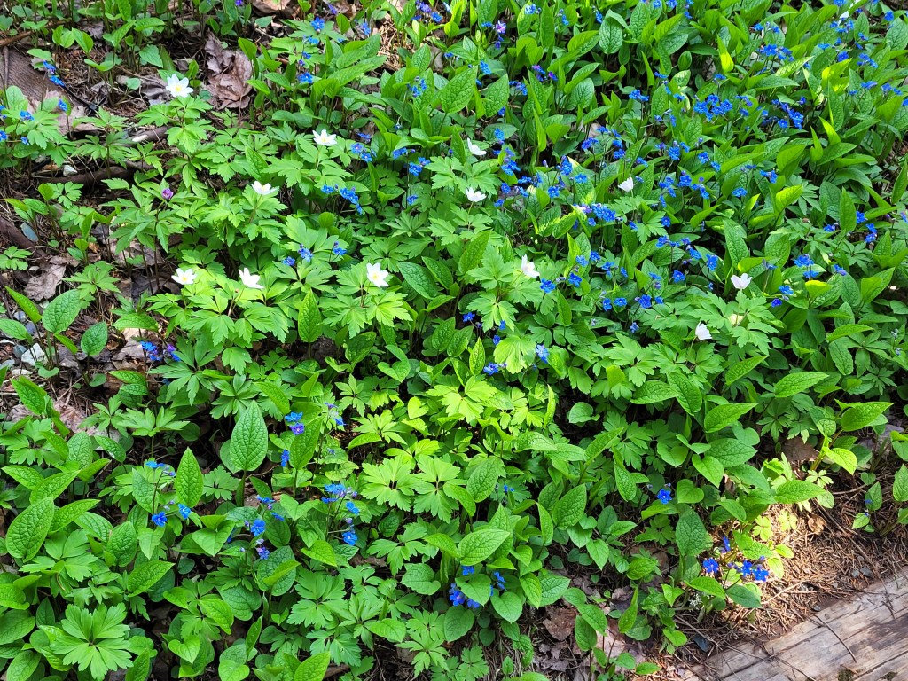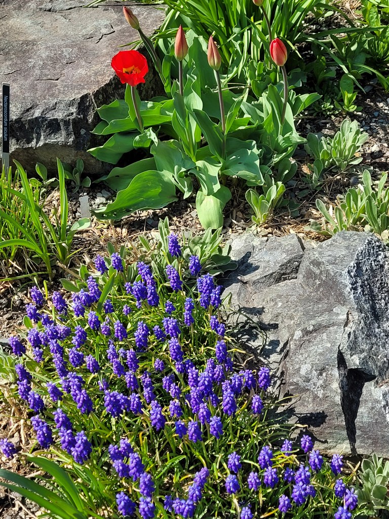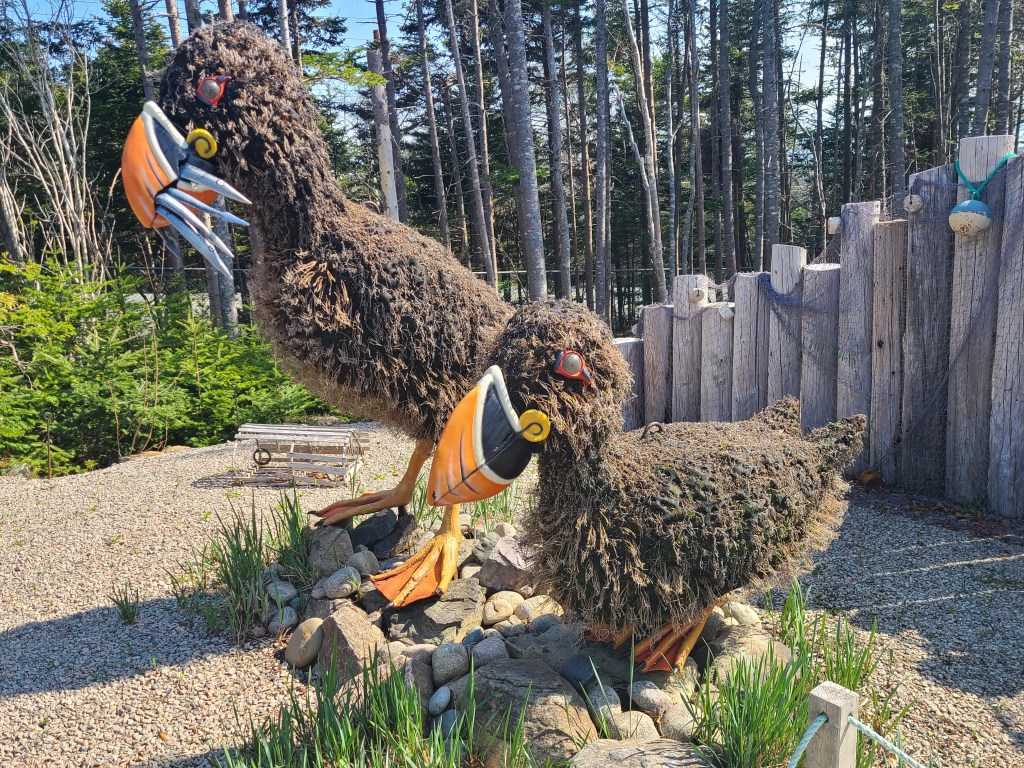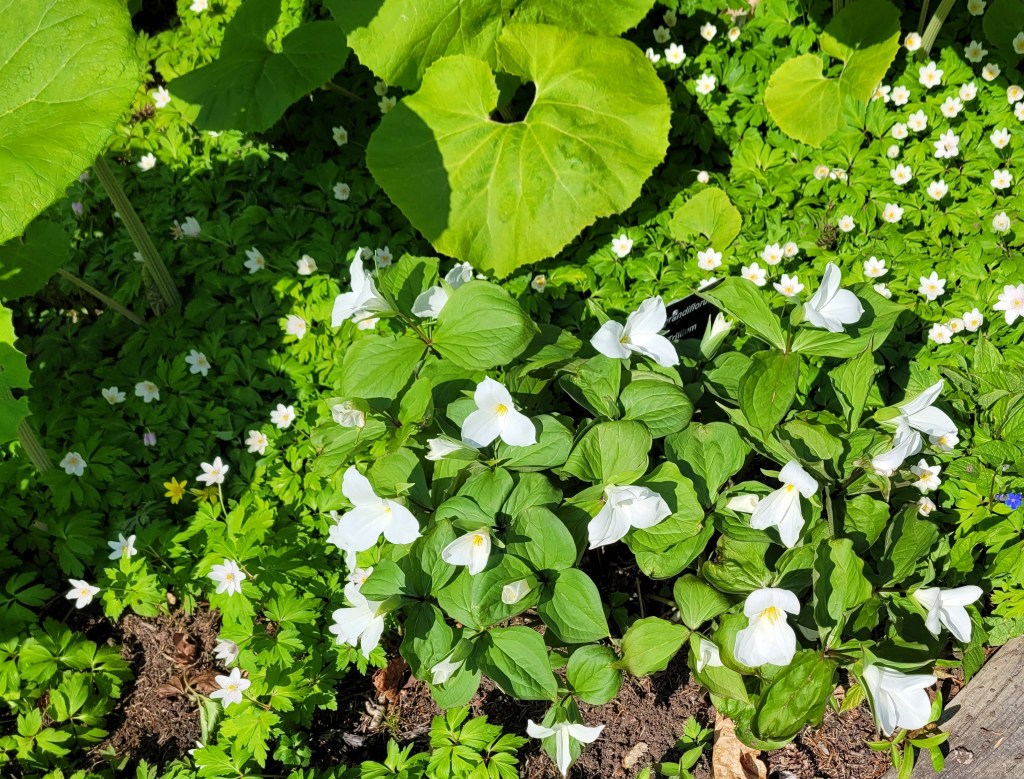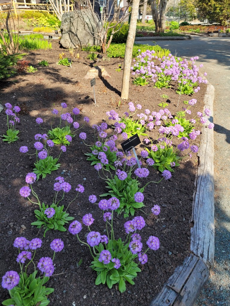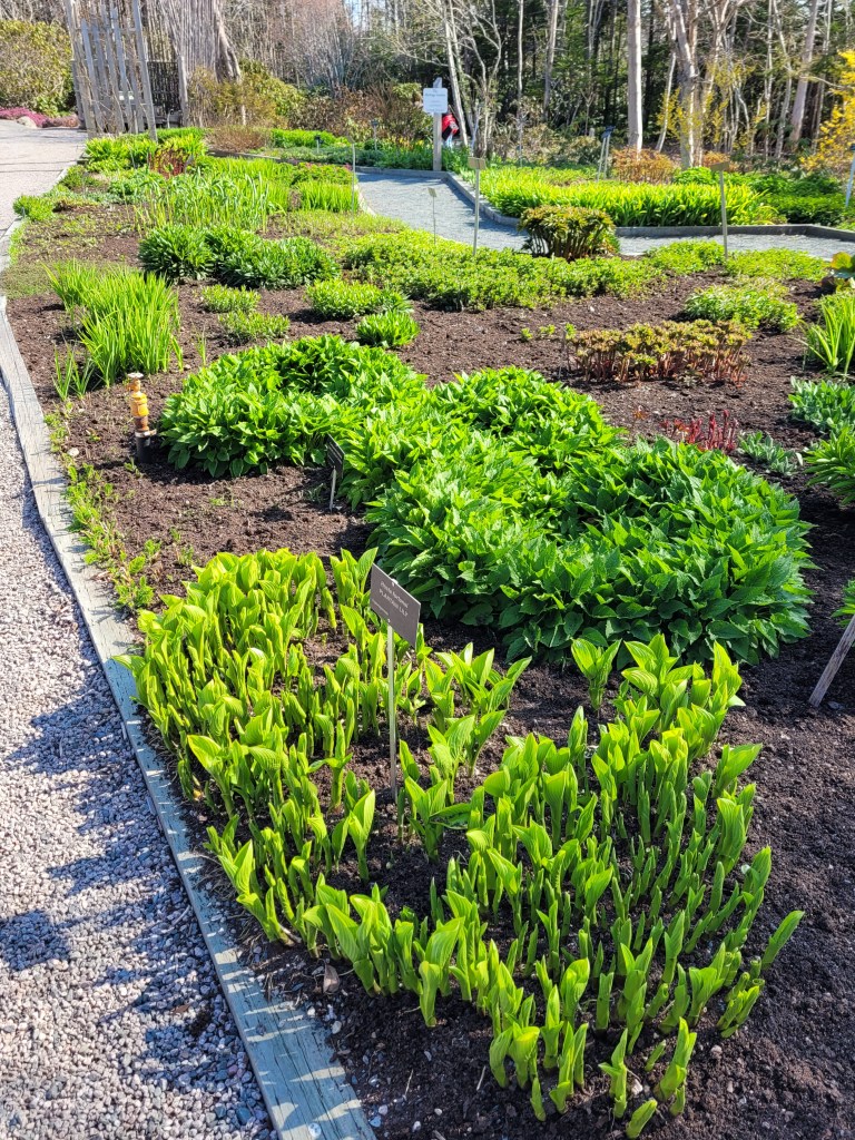 Spring flowers have just started to bloom, evidenced by the Rhododendron buds behind Doug.We saw many areas like this on the western portion of the Irish Loop.These Puffins, named Puff and Finn, are ready for their new “feathers” of annual blooms, soon to be planted by the Garden’s staff.Beautiful TrilliumWe took the trail to the pond, but the gardens were about to close, so we could not linger.One last stop to admire the flowersMaybe we’ll have time for another visit before we depart on 6/5.