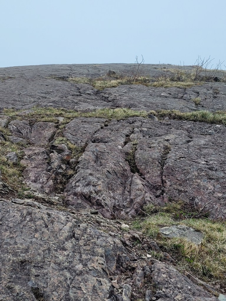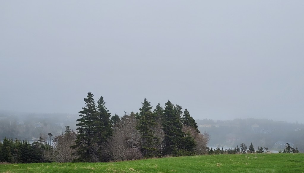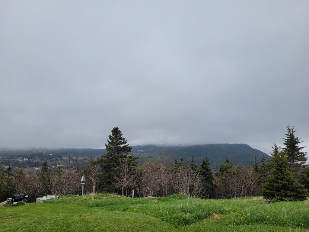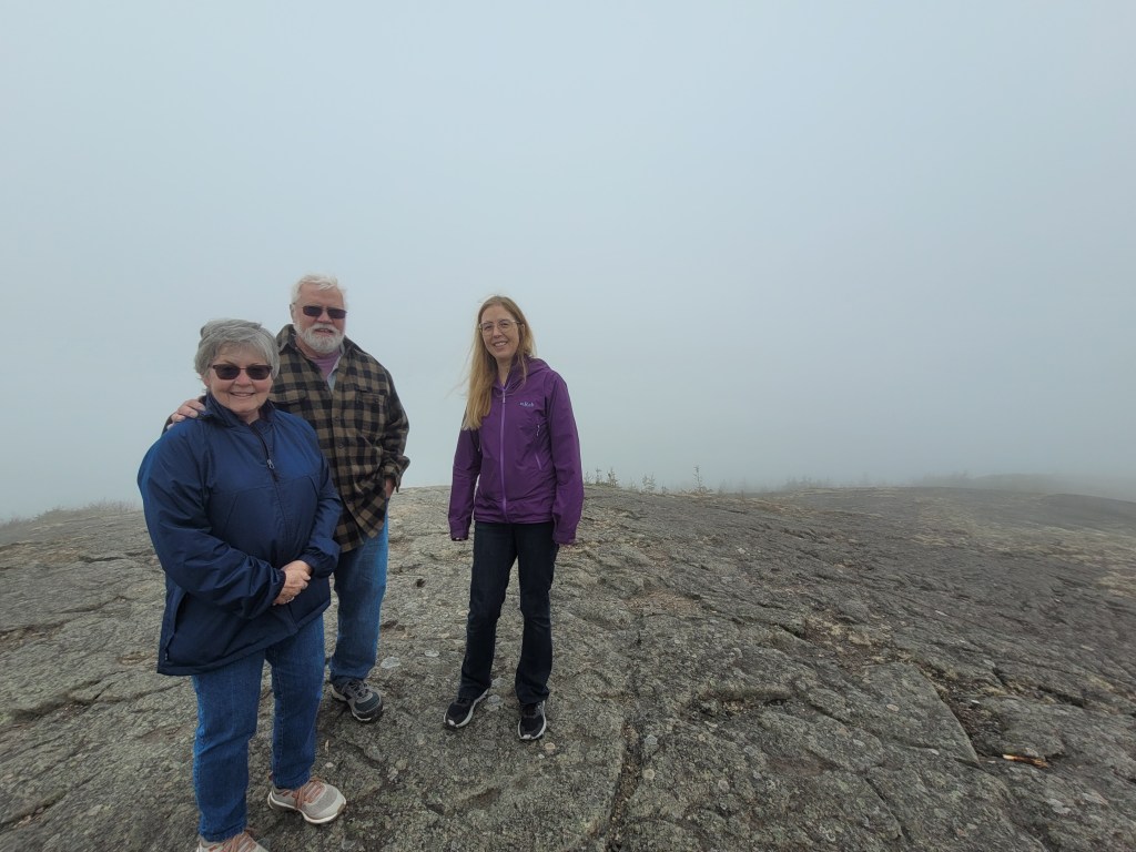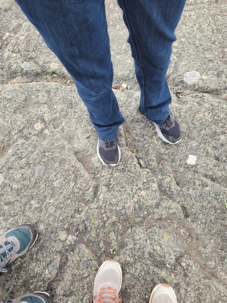These are two of the views from the home of David and Yvette, whom we met on Friday after they so graciously invited us to their beautiful home. Our acquaintance was initially made via email, thanks to a conversation they had with Katy and Steve a few months prior while the eight of them (two families) were vacationing in Costa Rica. “Where are you from?” led to ‘My parents are going to be camping there!” And that’s how we found ourselves sipping coffee, enjoying a bountiful homemade noontime meal, and sharing stories around their dining room table. We’ve frequently heard about the warmth and friendliness of Newfoundlanders, and we experienced it “times ten” on Friday. The Newfoundland Traveller’s Guide says, “You don’t need to be from here to belong here.” That is exactly how we were made to feel.After lunch, the four of us went for a walk through the woods and to the top of this enormous rock, where one could see Conception Bay and Bell Island, if it were a clear day. Not so today, unfortunately, but the wispy, billowing bursts of fog were actually very pretty.This picture was a mistake of mine with the camera, but I actually find it endearing; I just wish the fourth pair of shoes made it into the shot (and, I’m also quite amazed that my shoes made it into the picture at all πHere we are (photographed by David).