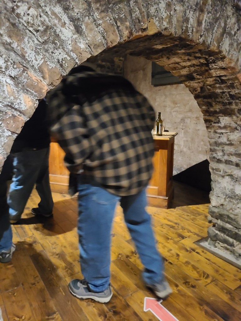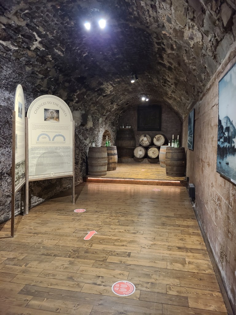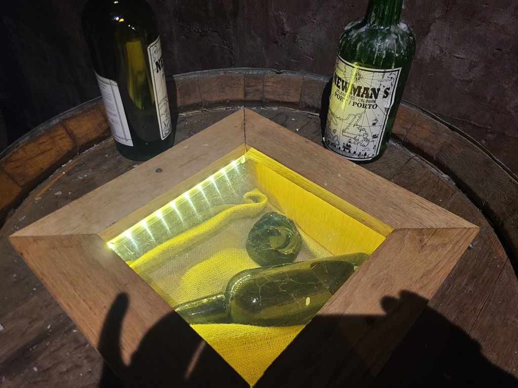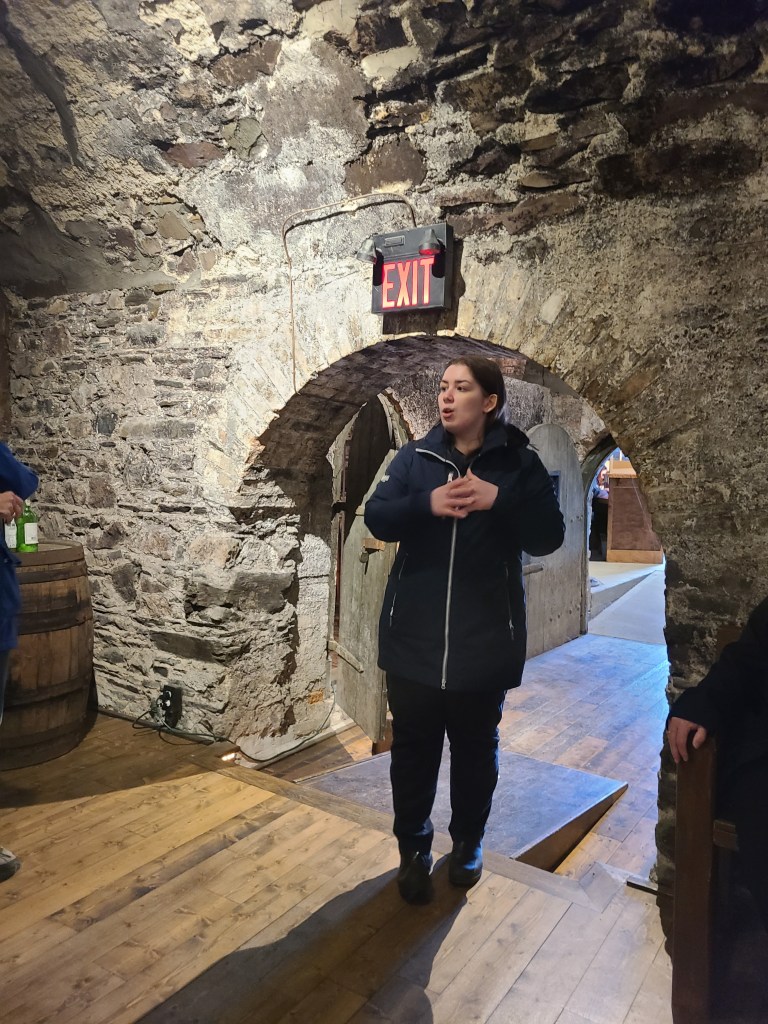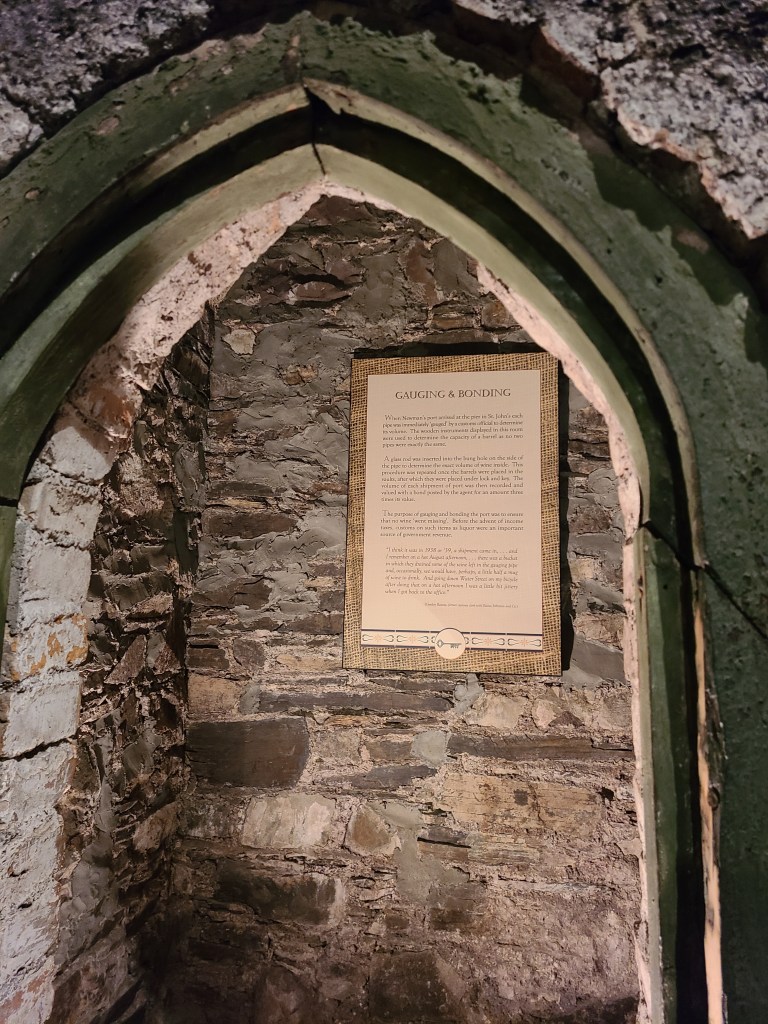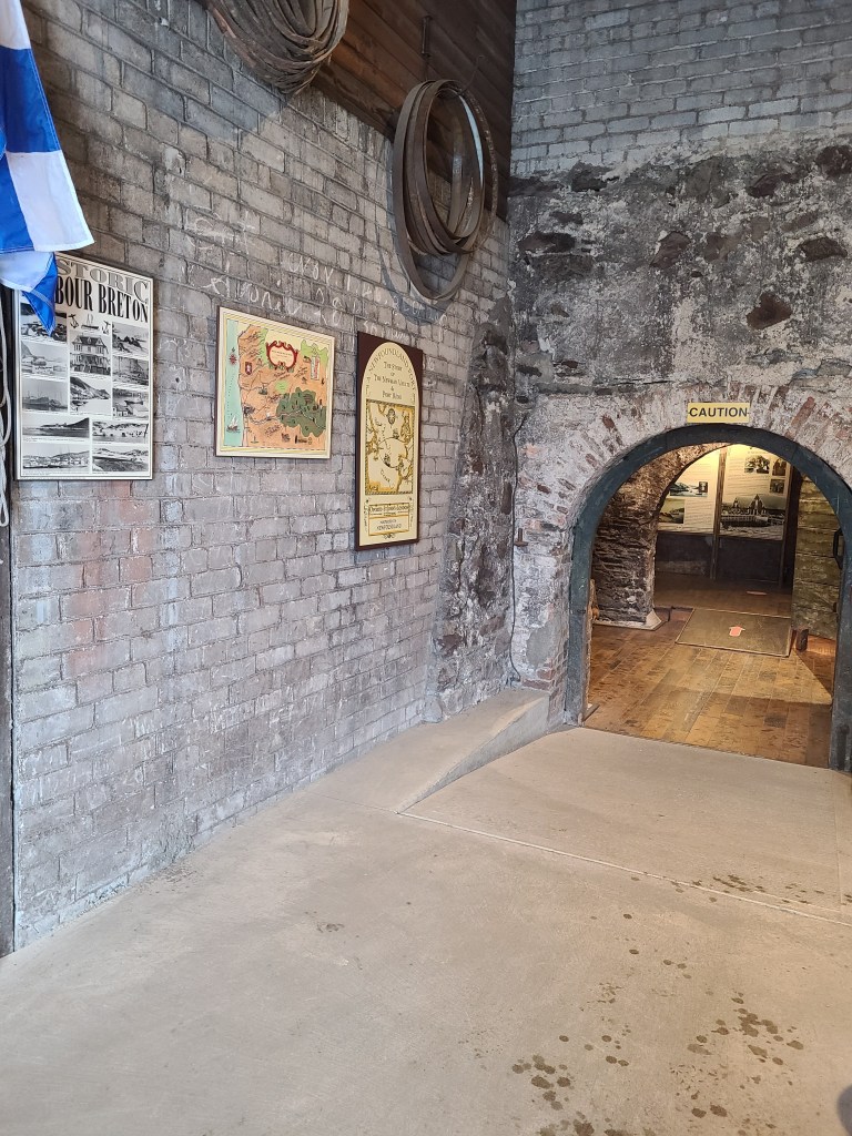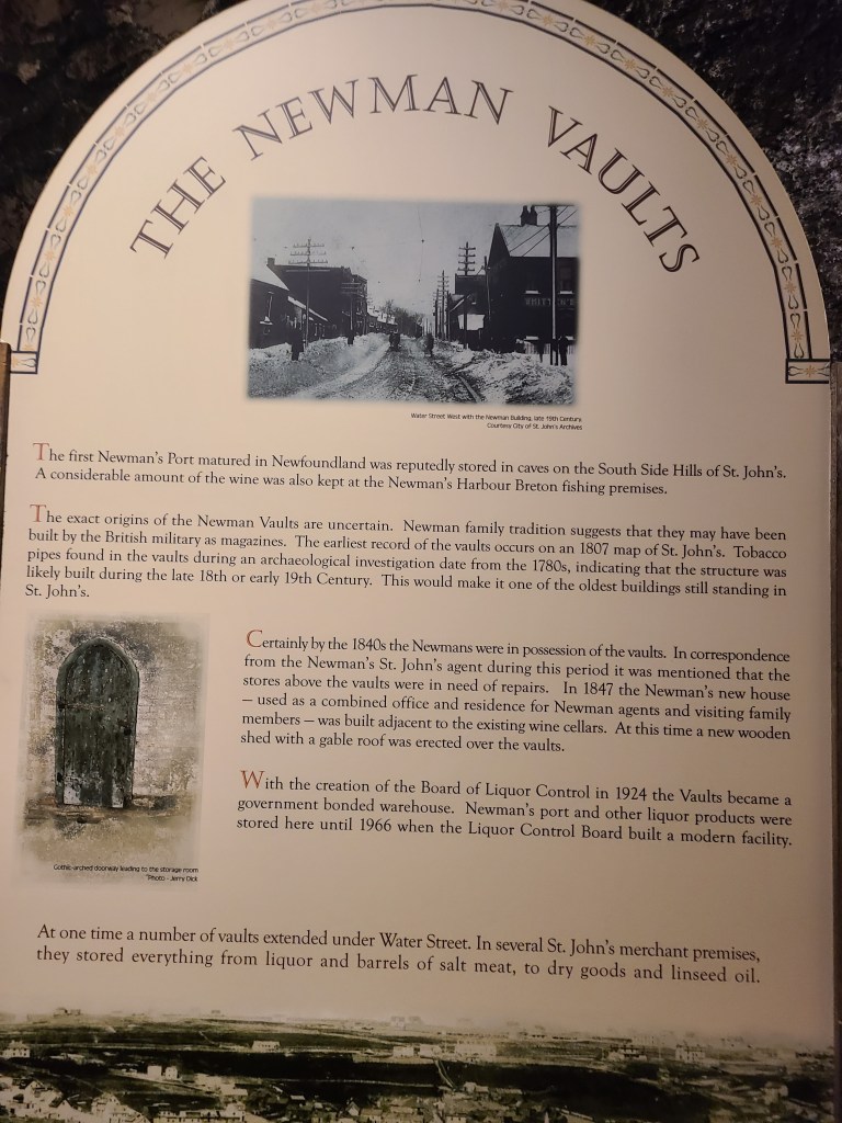These truffles are from the Jacobean organic craft chocolate company, which we first discovered at a gallery in Quidi Vidi. They had a booth at Saturday’s farmers market, and we couldn’t resist.This is not a wine tasting venue, but the actual cellars where Portuguese wine (Port) was aged in barrels over 300 years ago, then shipped over to England for the aristocracy to enjoy. The wine first ended up in Newfoundland after a Portuguese ship full of wine bound for London slipped its mooring and floated out to sea. After encountering severe storms, the ship found safe harbor in Newfoundland for the winter. When the wine was shipped back to England in the spring, it was discovered that it tasted much better after its cold aging, thus began the business of Newman wine cellars on Water Street in Newfoundland. Our tour guideOld bottles of Newman’s PortWe did have a tiny tasting at the end of the tour.