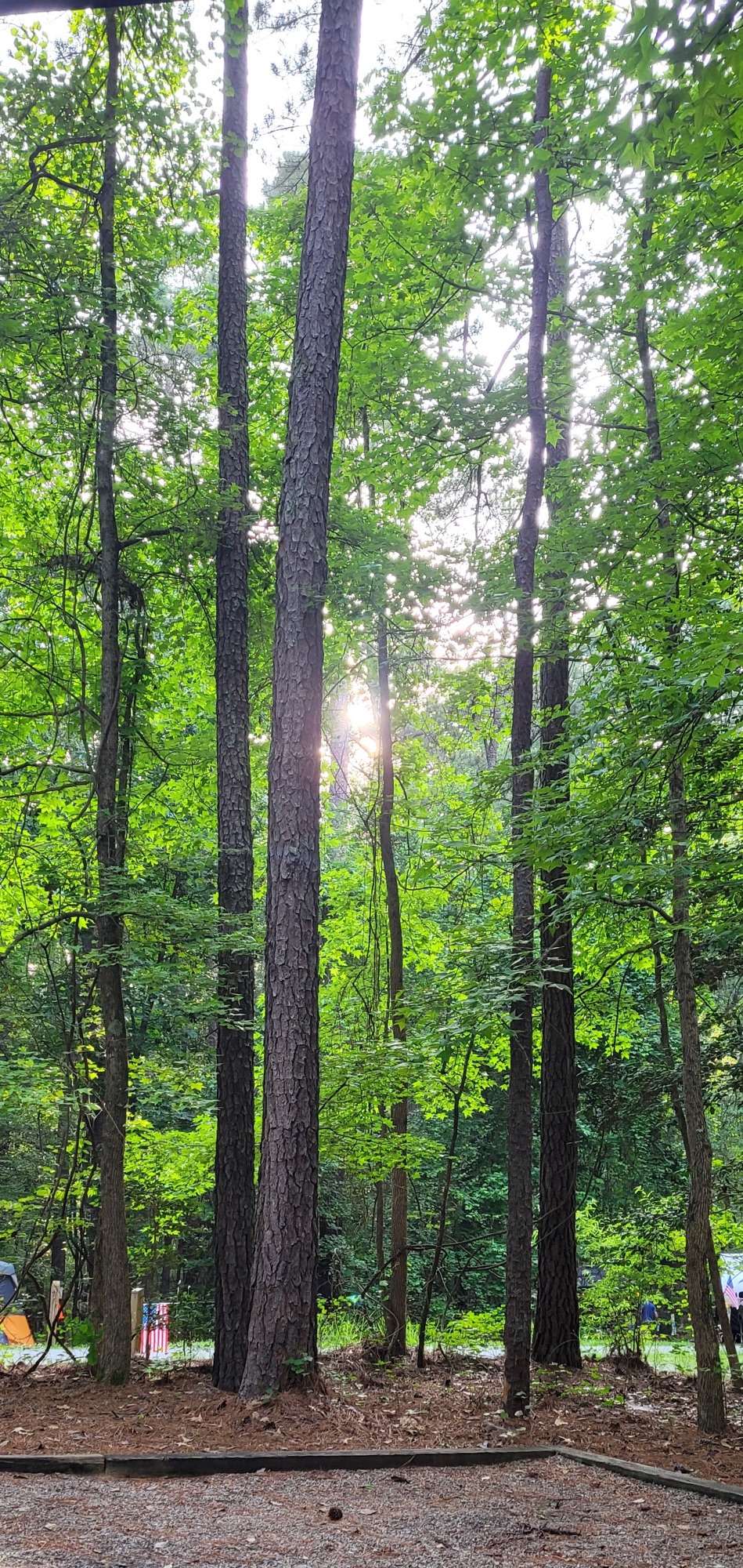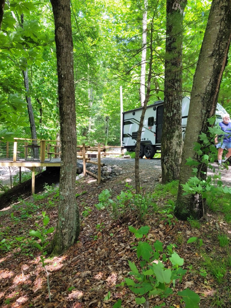 We left New Bern at 2 pm on May 26, 2024, and arrived at Jordan Lake a little before 5 pm., giving us approximately 2.5 hours to relax and have dinner before putting away the grill, chairs, rug, door mats, and awning – inclement weather was approaching. With everything secured, we went to bed – at 8:30!! (Getting ready for this trip was really quite a process!) That turned out to be a very wise move, because we were continuously awakened from 11 pm until 6 am by thunderstorms – we actually had a “lakefront” campsite until 10 am, but then the water receded, we hooked up to the truck and were on our way to Fancy Gap, VA.
