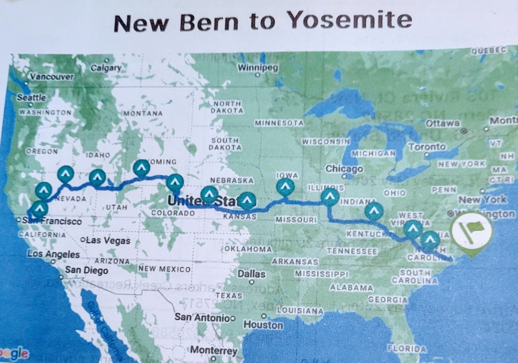 Wanderlust has struck again. It has been a little over 10 months since we returned from our Newfoundland camping trip, and now we’re traveling west instead of northeast. Yosemite is calling, and we’ve missed old friends we’ve not seen in almost 20 years. We hope we’ve timed our departure and calculated our route to avoid hazardous weather, with short distances between overnight stops. Below is a portion of our planned travel.