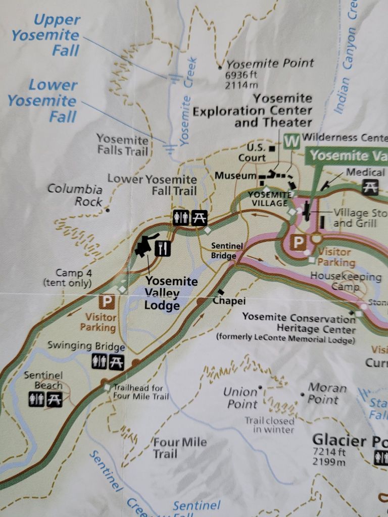 Now, a correction to an earlier post.  Doug has informed me that we did, in fact, hike the entire trail to the top of Yosemite Falls. I *thought* we had, because I remember sitting well-away from the cliff edge while watching some totally crazy guy swing from a rope out over the edge of the falls.  Even now, the thought makes my legs weak. Anyway, when writing my post a few days ago, I thought, “There’s no way we could have gone to the top,” but then again, I recall it was an all-day hike, and we were on the last few switchbacks of our descent as it was growing dark.    I should have double-checked.   :-]