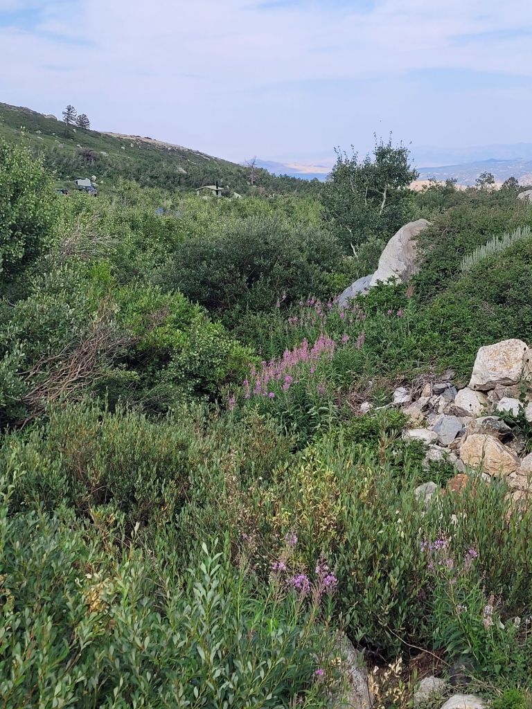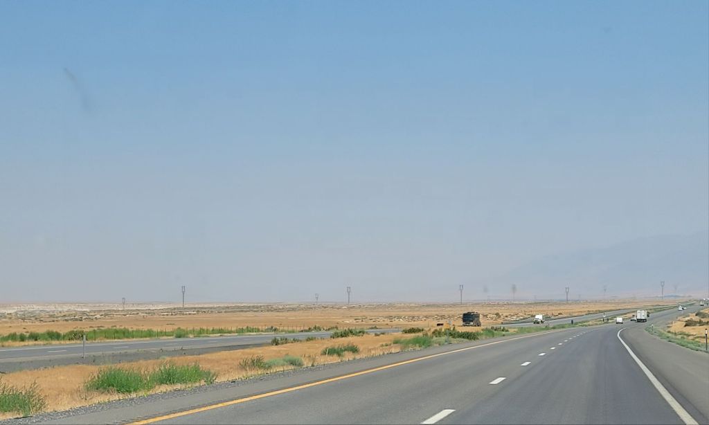 After arriving in Winnemucca, tired and hungry, we had dinner at a restaurant adjacent to the campground and were asleep by 9 pm.  Back on the road today (Friday, 8/2), I was very excited to be able to breathe in a normal fashion for the first time in 2 weeks.  Our campground tonight is in the small (7 sq. mi.) town of Wells, NV, with very big scenery on Rt. 231 up to and down from Angel Lake.