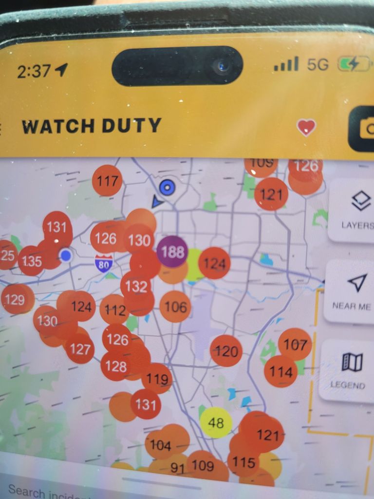 There is a mountain range that fills this photo from left to right, but because of the smoke, you can just barely see it on the right.