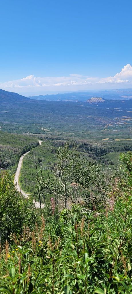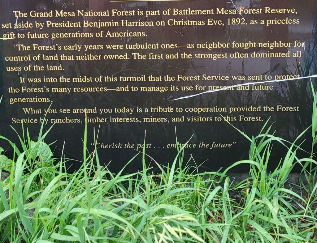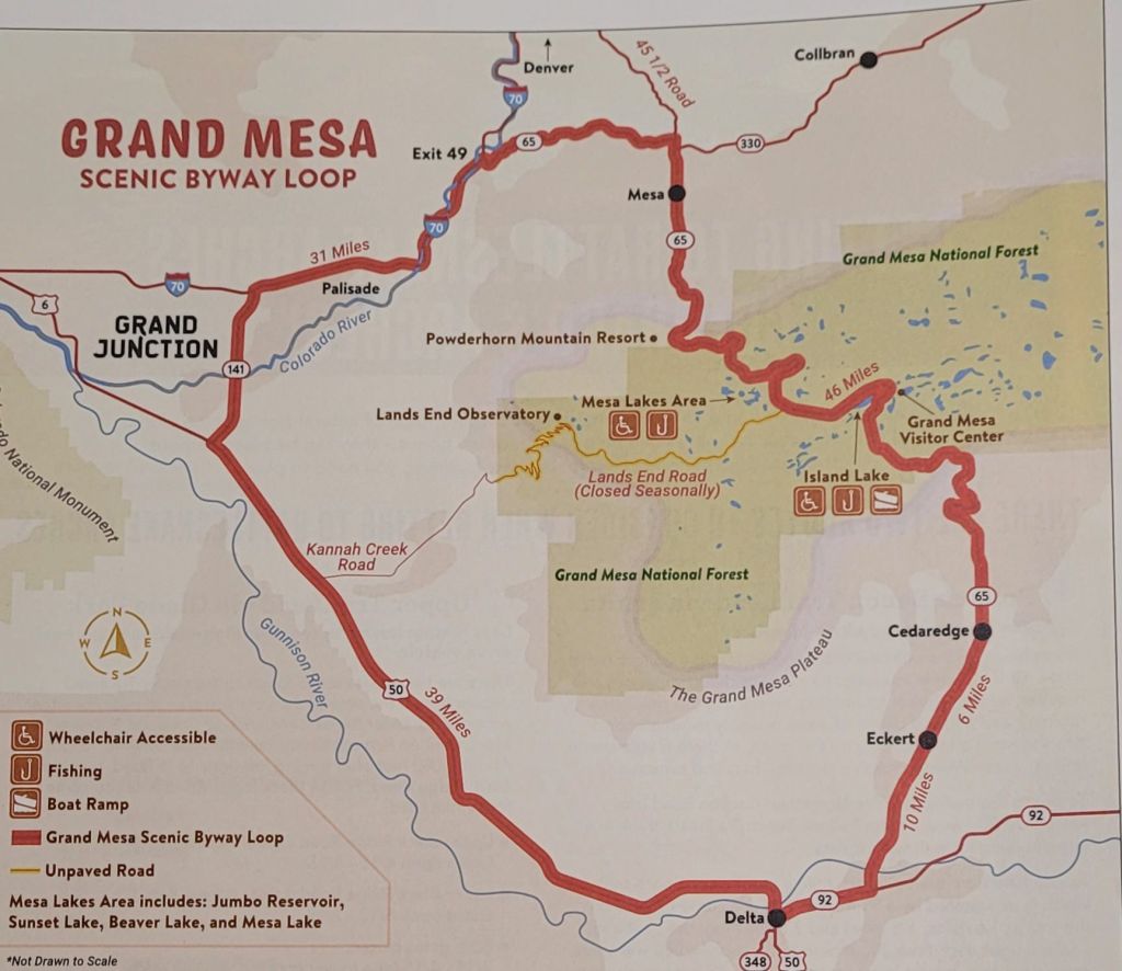 The Grand Mesa is the largest flat top mountain in the world (approx. 500 sq. mi.), with over 300 lakes, Powderhorn Ski Resort, and an elevation of over 11,000 ft.  We drove through part of the park from the entrance at Delta to Powderhorn Ski Resort, and that filled up our afternoon.
