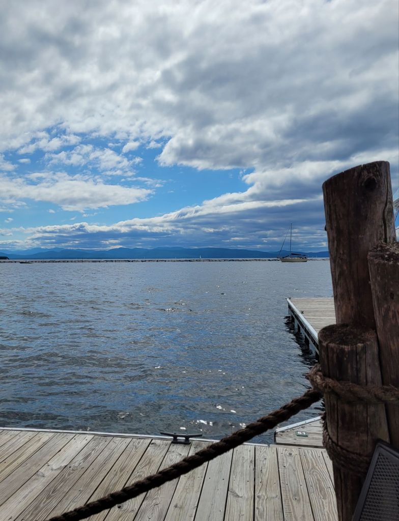 During our travels in mid-June, Doug experienced a problem with the vision in his right eye, so we made an appointment with the office of our former eye doctor in Rochester.  (We had planned to camp in the Adirondacks, so we were already near the area.)   Doug was diagnosed with a vitreous separation in his right eye, though he was given the OK to continue travel; however, he was cautioned to get immediate care should his vision change in that eye.  Unfortunately, that became a reality towards the end of June, so we decided the best thing to do would be to drive back for another appointment in Rochester.  (Sitting on the shore of Lake Champlain in Vermont, we could see New York on the other side!)